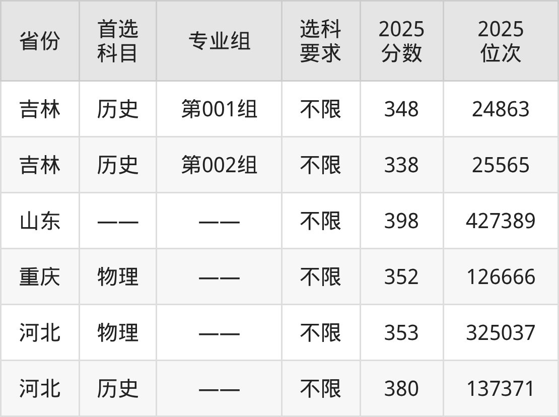 历史类各专业组分数线:第001组348分、第002组338分。