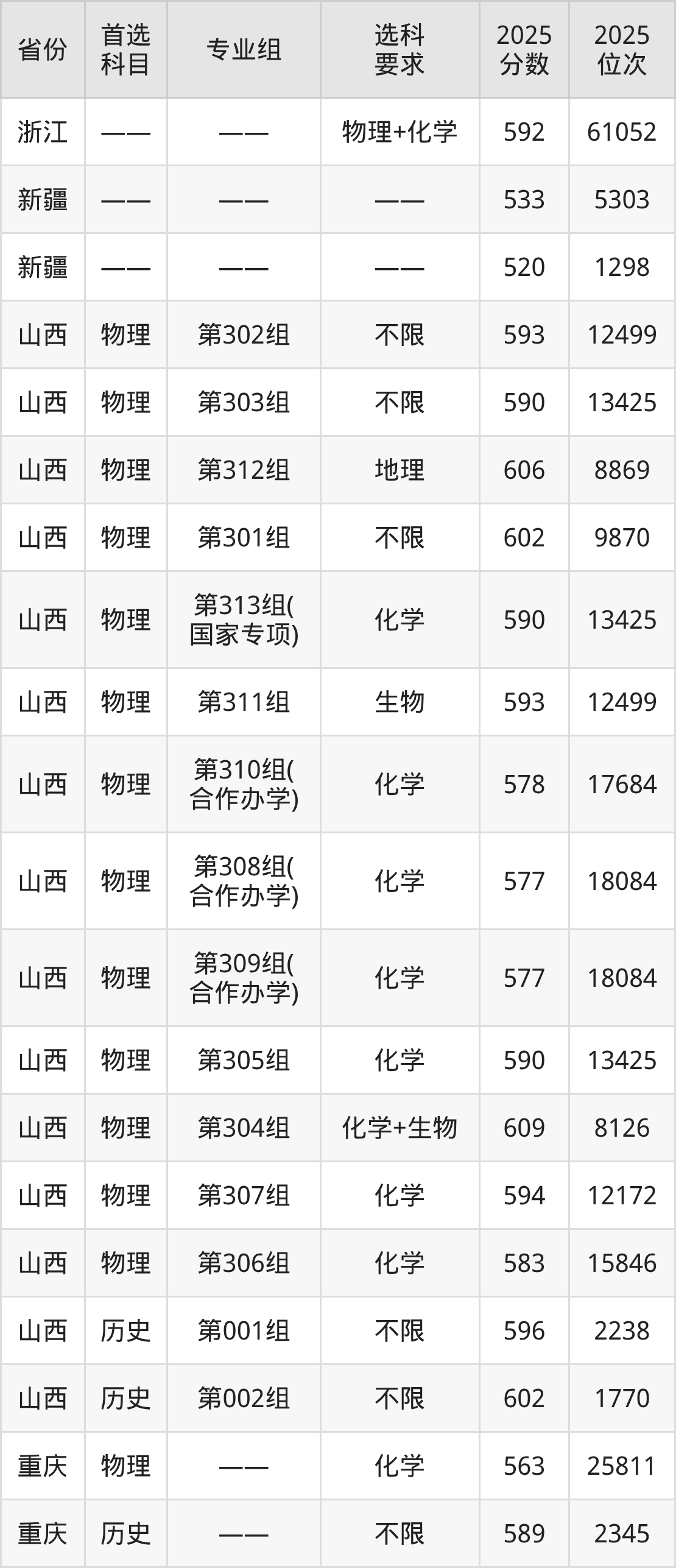 物理类各专业组分数线:第302组593分、第303组590分、第312组606分、第301组602分、第313组(国家专项)590分、第311组593分、第310组(合作办学)578分、第308组(合作办学)577分、第309组(合作办学)577分、第305组590分、第304组609分、第307组594分、第306组583分。