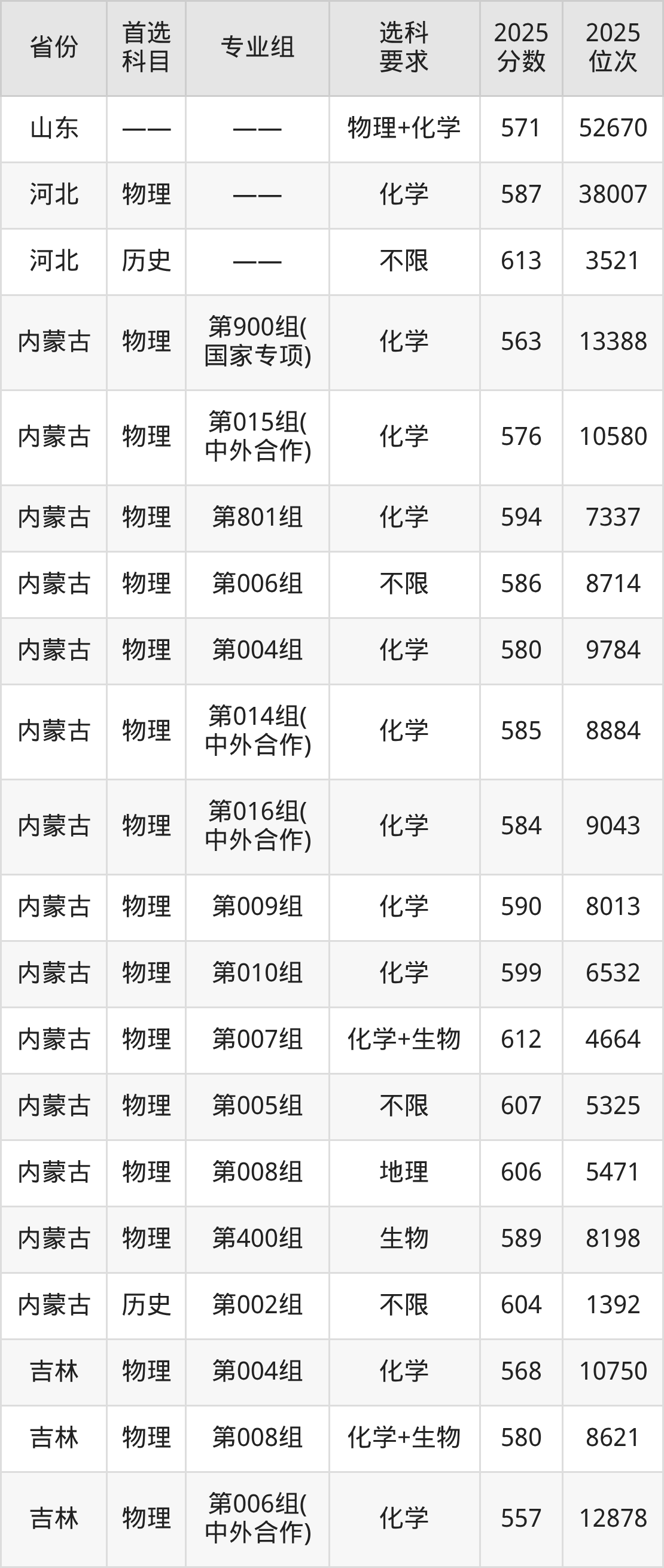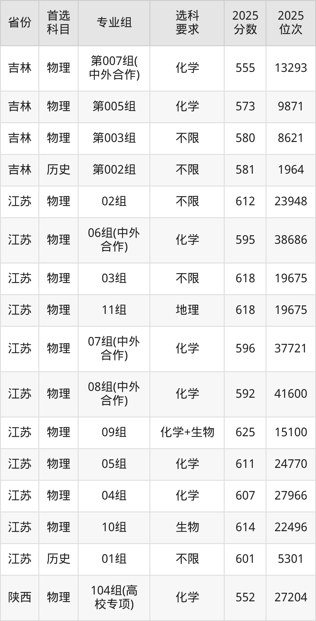 物理类各专业组分数线:02组612分、06组(中外合作)595分、03组618分、11组618分、07组(中外合作)596分、08组(中外合作)592分、09组625分、05组611分、04组607分、10组614分。