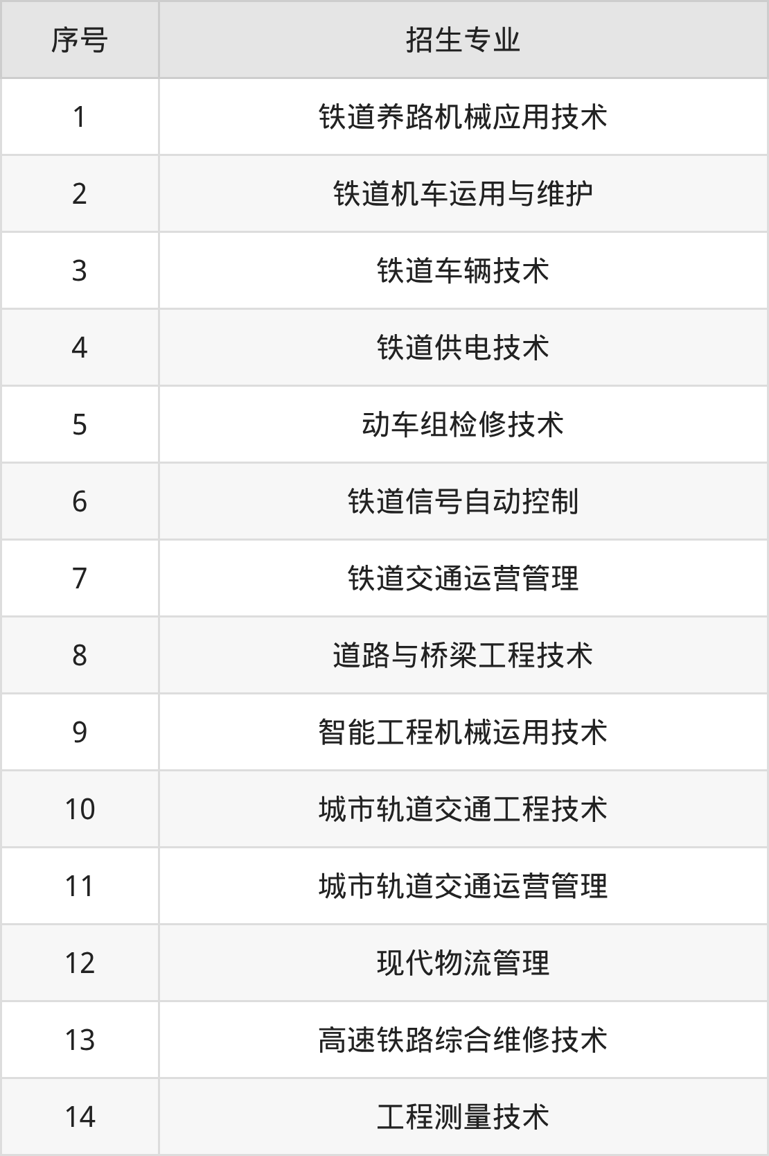 建筑装饰工程技术、建筑工程技术、地下与隧道工程技术、土木工程检测技术、供热通风与空调工程技术、工程造价、机电一体化技术、铁道机车车辆制造与维护、铁道工程技术、高速铁路施工与维护