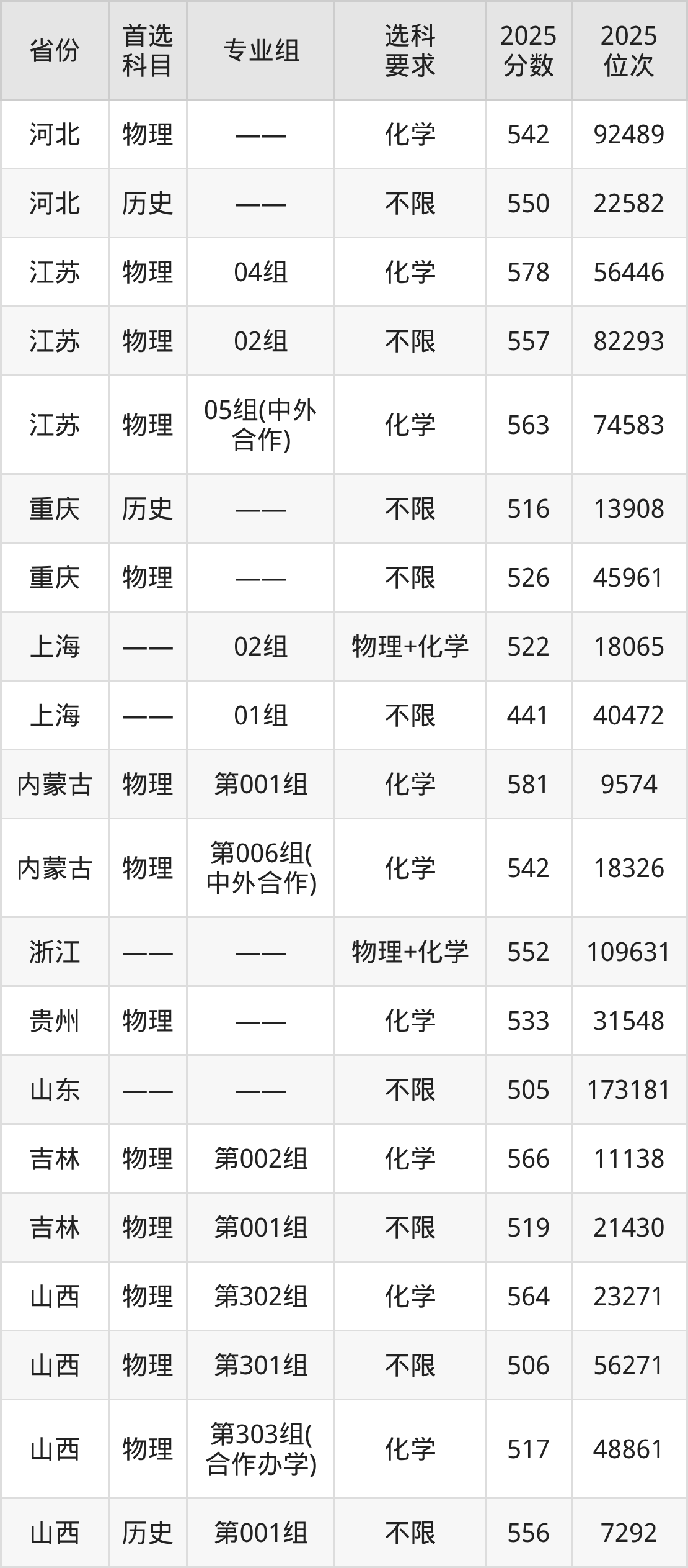 物理类各专业组分数线:第001组581分、第006组(中外合作)542分。