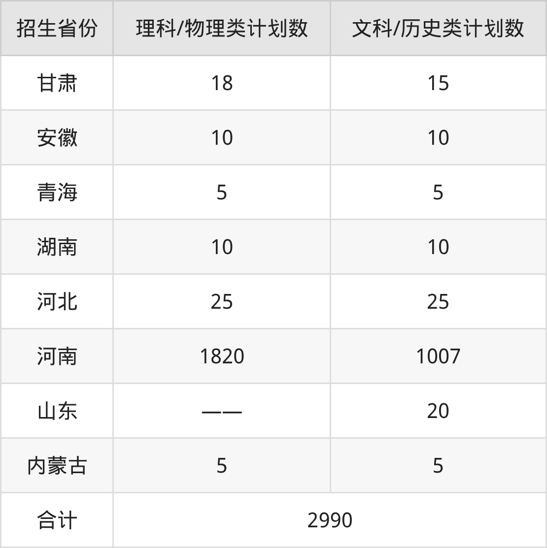 河南农业职业学院招生简章显示:学校在全国8个省(市、自治区)招收2990人,包括历史类1077人、物理类1893人、3+3省份20人,招生专业有种子生产与经营、现代农业技术、园艺技术等。