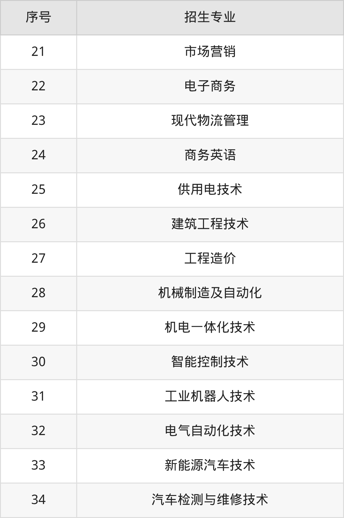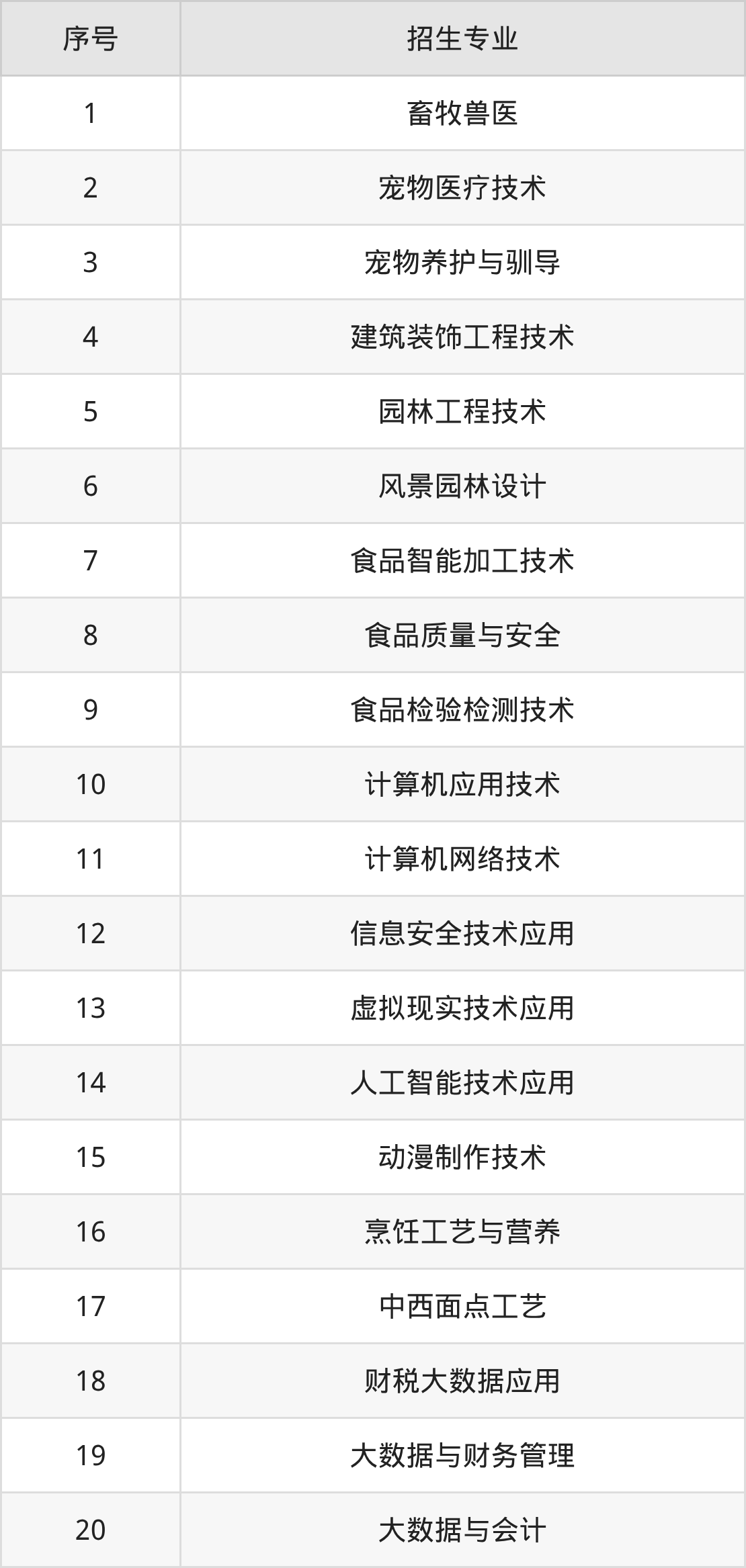 种子生产与经营、现代农业技术、园艺技术、植物保护与检疫技术、中草药栽培与加工技术、现代农业装备应用技术、农产品加工与质量检测、园林技术、花卉生产与花艺、动物医学