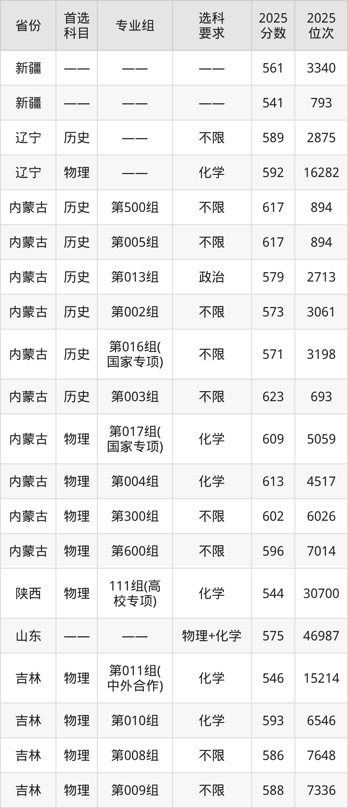 物理类各专业组分数线:第011组(中外合作)546分、第010组593分、第008组586分、第009组588分、第012组(国家专项)579分。