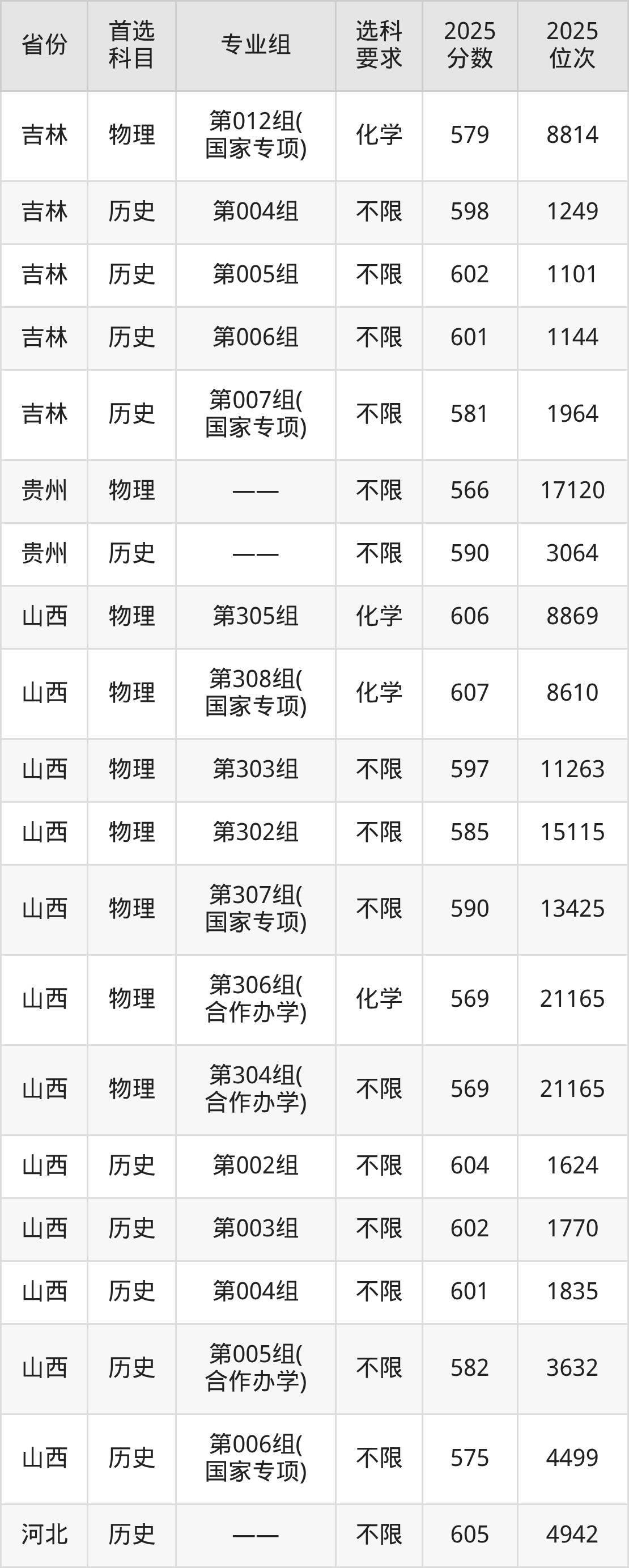 历史类各专业组分数线:第004组598分、第005组602分、第006组601分、第007组(国家专项)581分。