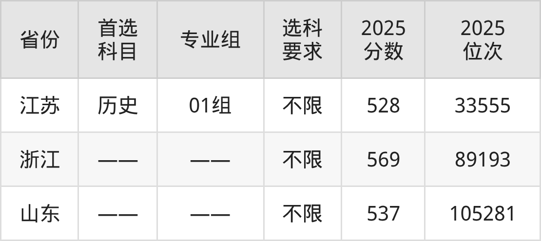 历史类各专业组分数线:01组528分。