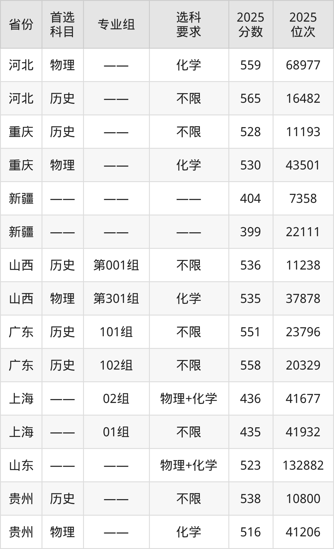 物理类各专业组分数线:第301组535分。