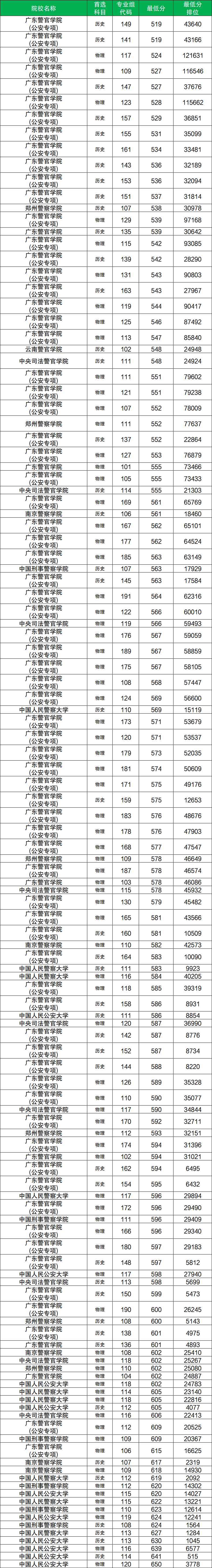 其中物理类分数至少在524分及以上、历史类分数至少在519分及以上才有机会被录取。而物理类分数最低的院校是广东警官学院(117专业组),历史类分数最低的院校是广东警官学院(141/149专业组)。下面是各校最低分详情: