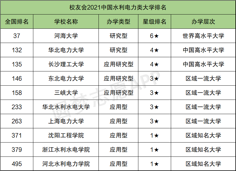 根据校友会2021年中国水利电力大学排名情况来看,以下10所院校是国内水利水电类专业比较强的大学名单,其中河海大学水利电力类专业实力最强,其次是华北电力大学,非常值得大家报考。