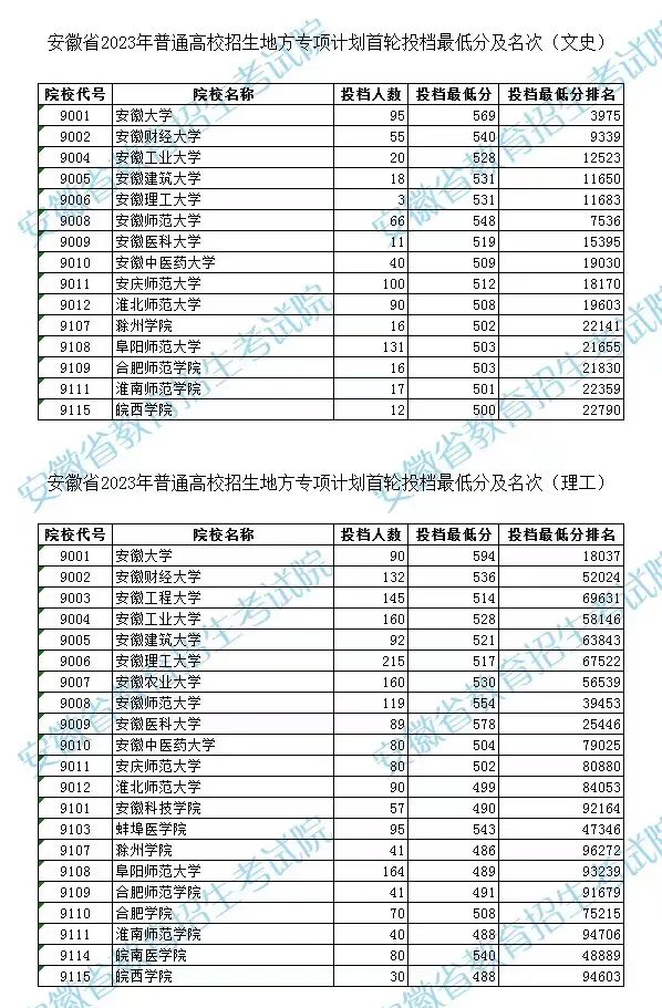 从以上整理的数据可知,2023年安徽省地方专项计划大学名单一共有21所,其中在文科招生的有15所,在理科招生的有21所。2023年安徽地方专项计划录取分数线最低理科586分、文科500分。下面是2023年安徽地方专项大学名单及分数线一览表: