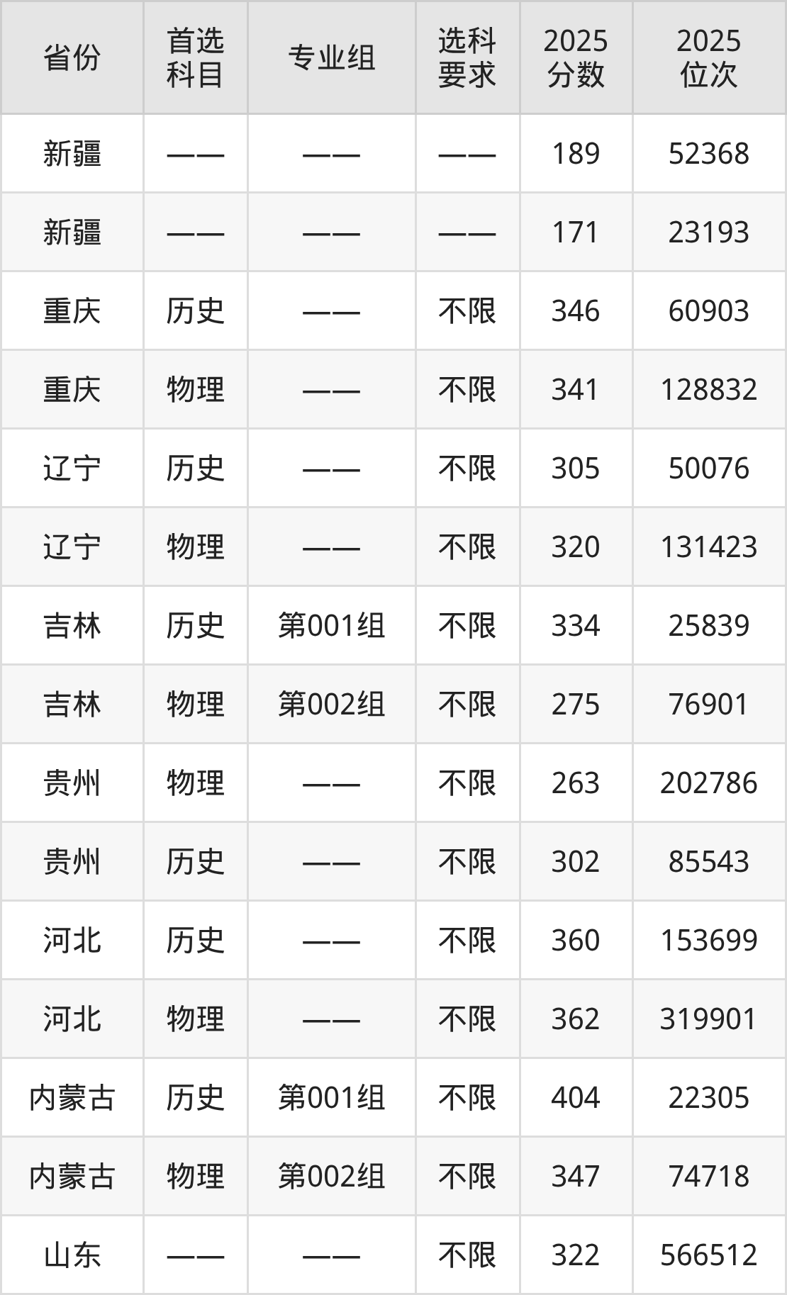 历史类各专业组分数线:第001组334分。