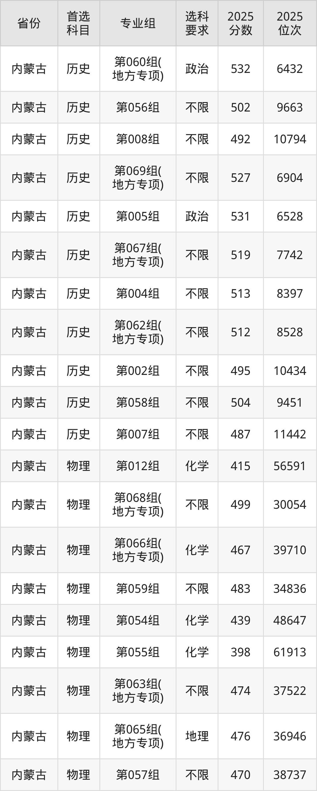 历史类各专业组分数线:第060组(地方专项)532分、第056组502分、第008组492分、第069组(地方专项)527分、第005组531分、第067组(地方专项)519分、第004组513分、第062组(地方专项)512分、第002组495分、第058组504分、第007组487分。