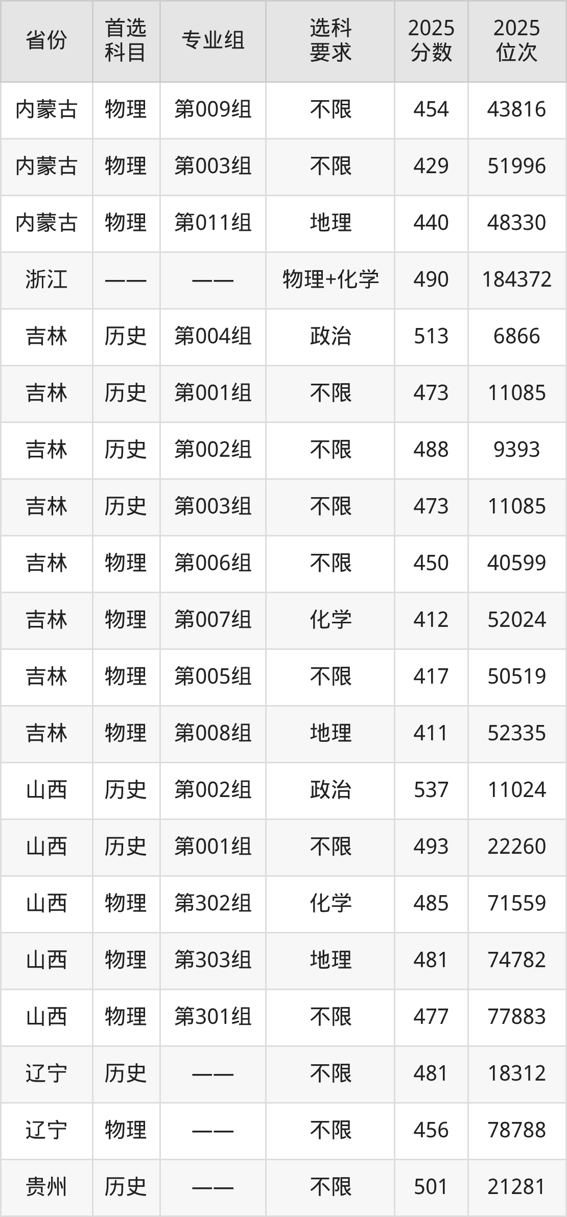 物理类各专业组分数线:第012组415分、第068组(地方专项)499分、第066组(地方专项)467分、第059组483分、第054组439分、第055组398分、第063组(地方专项)474分、第065组(地方专项)476分、第057组470分、第009组454分、第003组429分、第011组440分。
