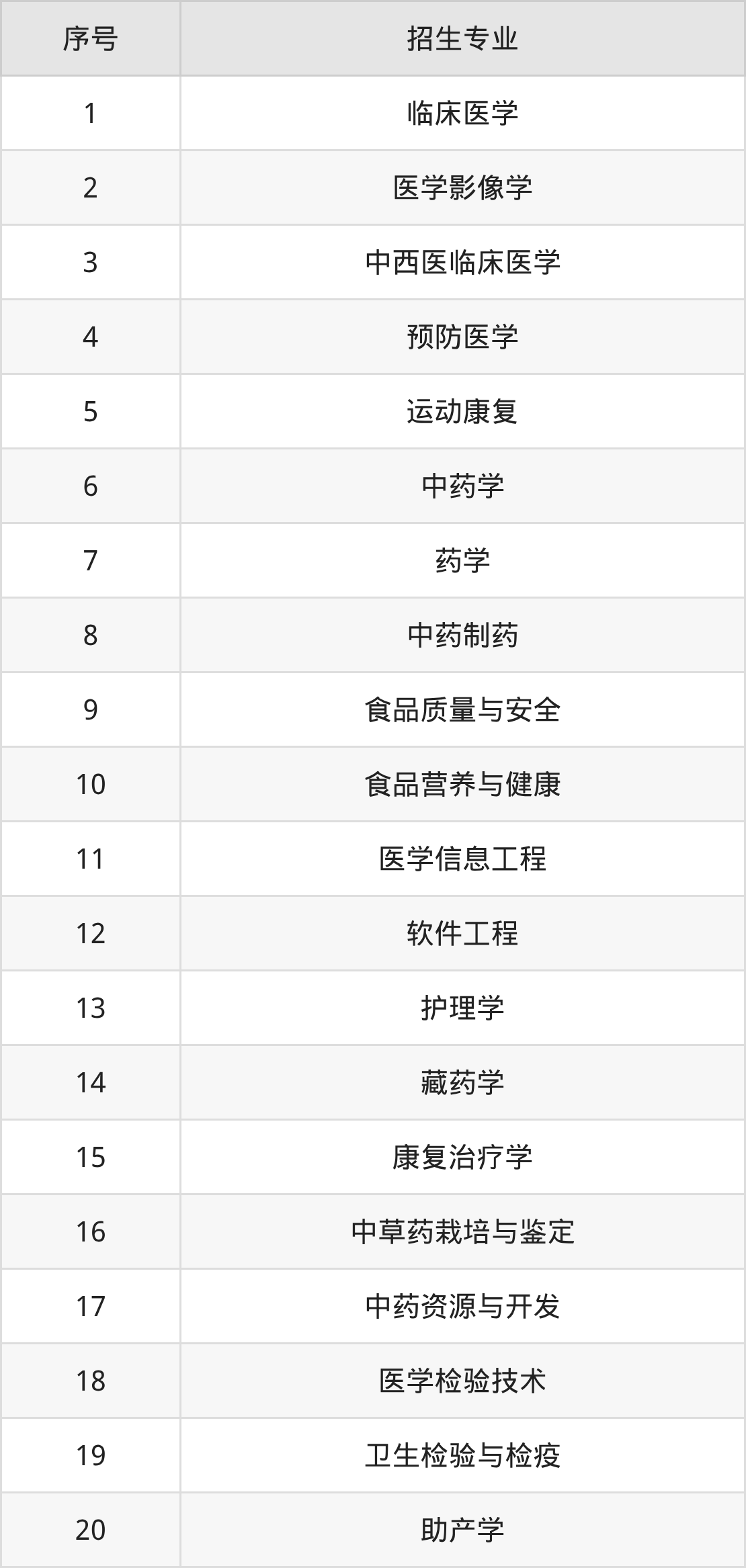 中医学、中医骨伤科学、针灸推拿学、中医康复学、藏医学、医疗保险、国际经济与贸易、公共事业管理、汉语言文学、健康服务与管理