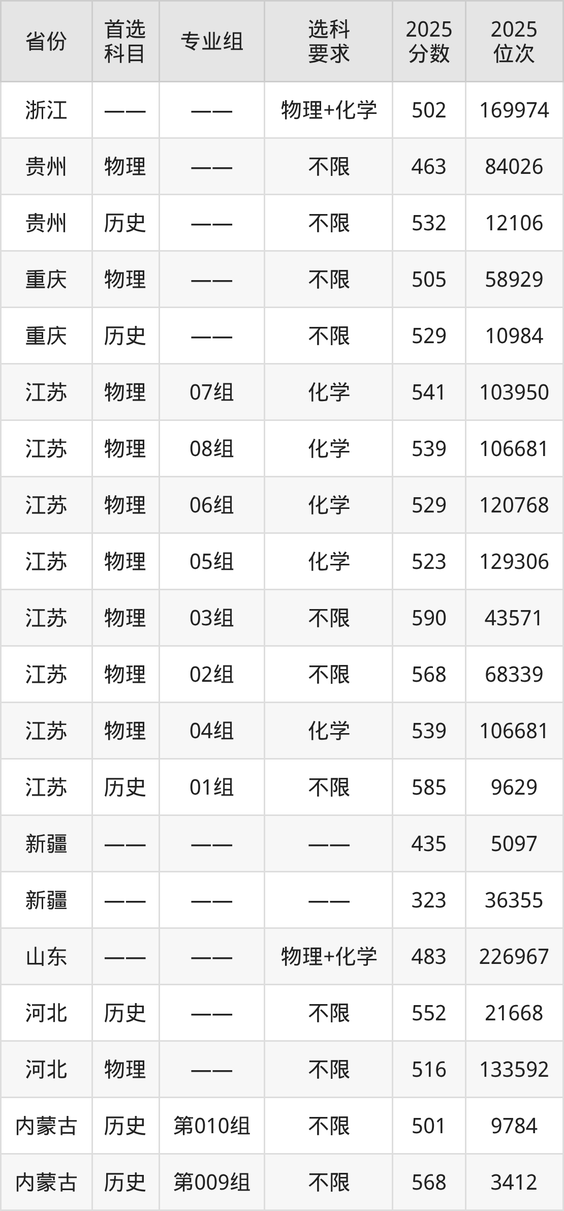 物理类各专业组分数线:07组541分、08组539分、06组529分、05组523分、03组590分、02组568分、04组539分。