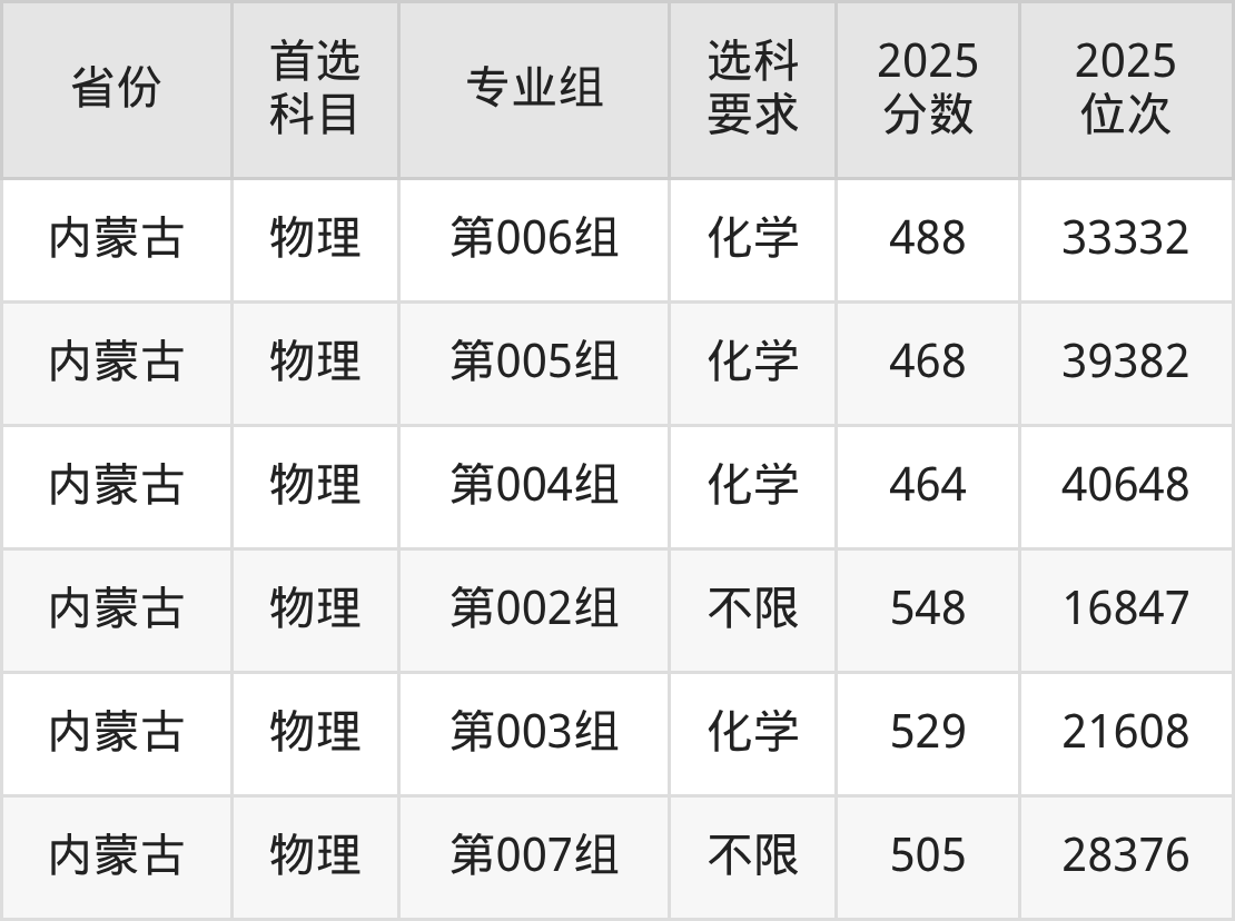 物理类各专业组分数线:第006组488分、第005组468分、第004组464分、第002组548分、第003组529分、第007组505分。