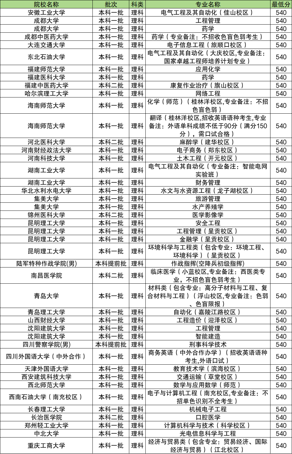 从全国大学四川省高考的分数来看,540分的理科考生能报考的专业,以及对应的学校如下表: