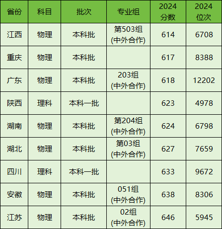 2024年电子科技大学统招中外合作录取分数线位于614分到646分之间,各省最低分如下表所示。