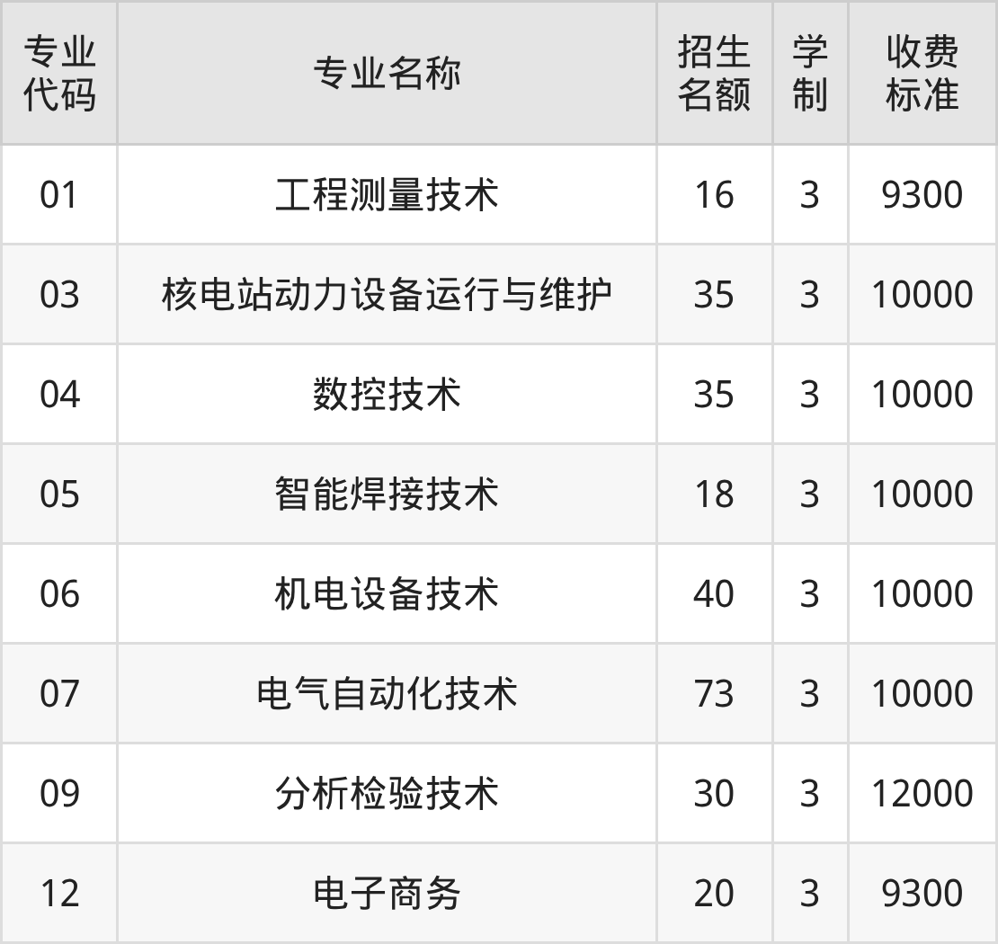 广元中核职业技术学院工程测量技术专业在专科批历史类招12人,学制3年,专业招生代码是01,学费是9300元一年。广元中核职业技术学院安全技术与管理专业在专科批历史类招5人,学制3年,专业招生代码是02,学费是9300元一年。