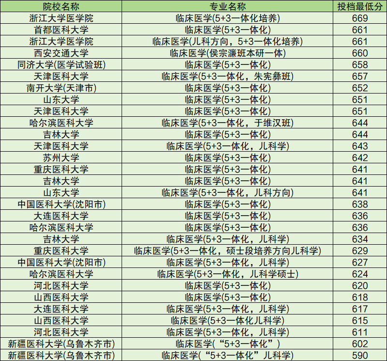 具有临床医学5+3一体化培养资格的高校有20多所,其中录取分数线最高的是浙江大学医学院(669分),分数线最低的是新疆医科大学(儿科学590分)。不难发现,5+3一体化的分数线比八年制稍微低一些,但大多数录取最低分仍然在620分以上。