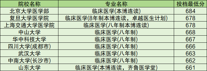 招生院校有9所,录取分数线位于661分到684分之间,最难考的是北京大学医学部、最好考的是山东大学。想报考临床医学八年制的同学可根据自己的分数情况进行选择。