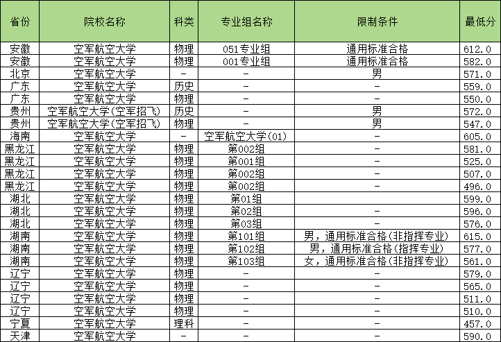 | 空军航空大学 | 物理 | 第101组(通用标准合格) | 男 | 592 |