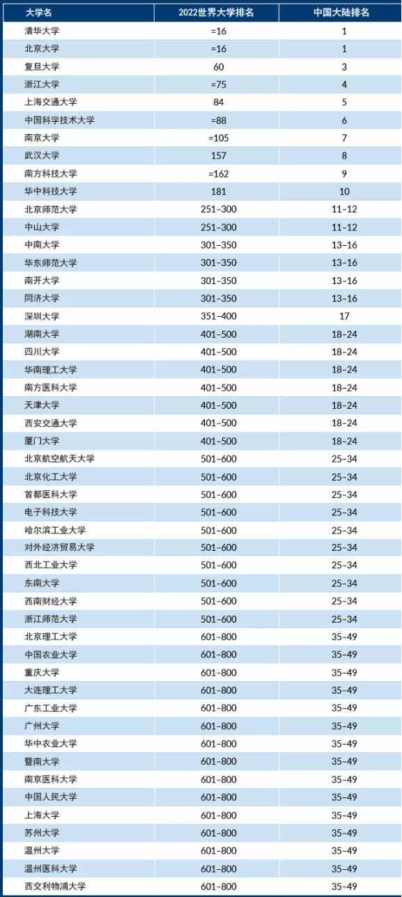 2022年泰晤士世界大学排名中国高校的入围情况如下: