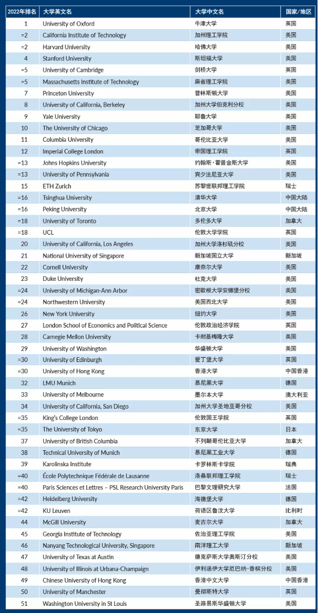 除了前十高校外,其他TOP50高校基本上也都被美国和英国高校所占据。泰晤士高等教育2022年世界大学排行榜TOP50的详细情况如下: