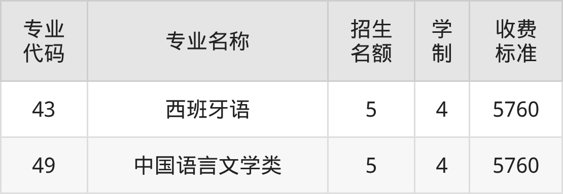 西南科技大学西班牙语专业在本科批A段(国家专项)历史类招5人,学制4年,专业招生代码是43,学费是5760元一年。西南科技大学中国语言文学类专业在本科批A段(国家专项)历史类招5人,学制4年,专业招生代码是49,学费是5760元一年。