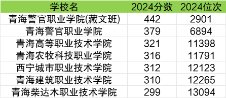 2024年青海文科收分最低的公办大专是青海柴达木职业技术学院,最低分是299分,对应位次是13094名;收分最高的公办大专是青海警官职业学院(藏文班),最低分是442分,对应位次是2901名;