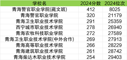 2025青海排名靠前的公办大专有青海建筑职业技术学院、青海警官职业学院、青海卫生职业技术学院、青海农牧科技职业学院等;2024年青海公办大专院校最低录取分数线是:文科299分、理科254分,完整名单排名及分数线一览表如下。
