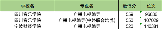 广播电视编导专业中靠前的大学分数线区间在559-520分。其中录取分数线排名前3名是四川音乐学院、宁波财经学院。