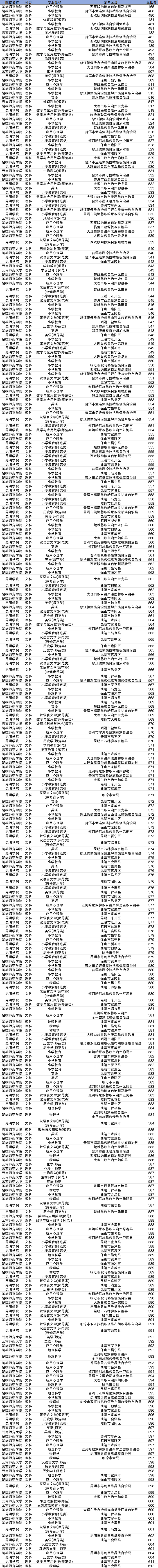 云南地方公费师范生录取分数线完整版一览表(需滑动查阅):