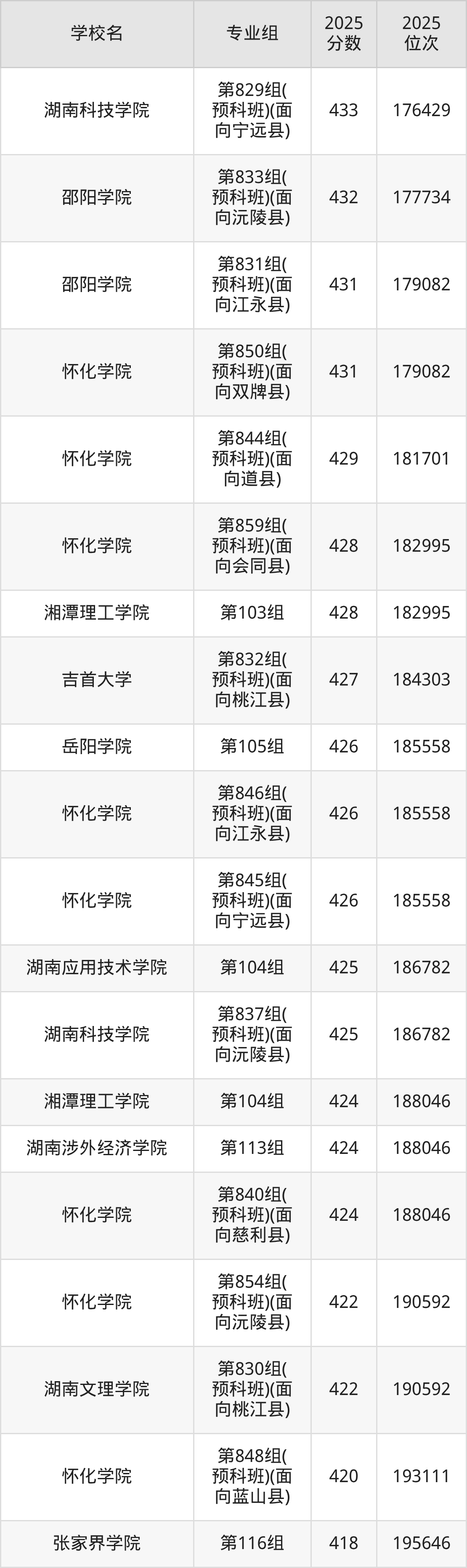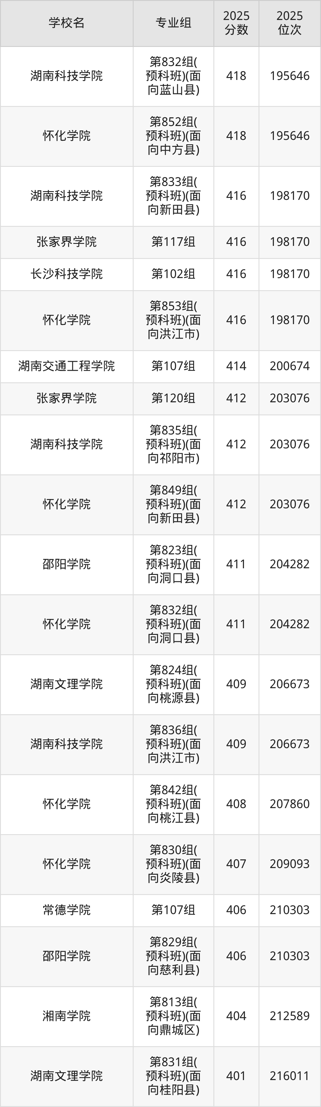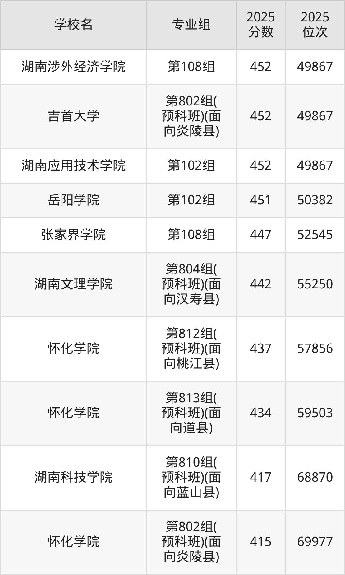 2025年湖南二本大学最低录取分数线历史类是415分,分数线最低的学校是怀化学院,对应收分最低的专业组是第802组(预科班)(面向炎陵县)。