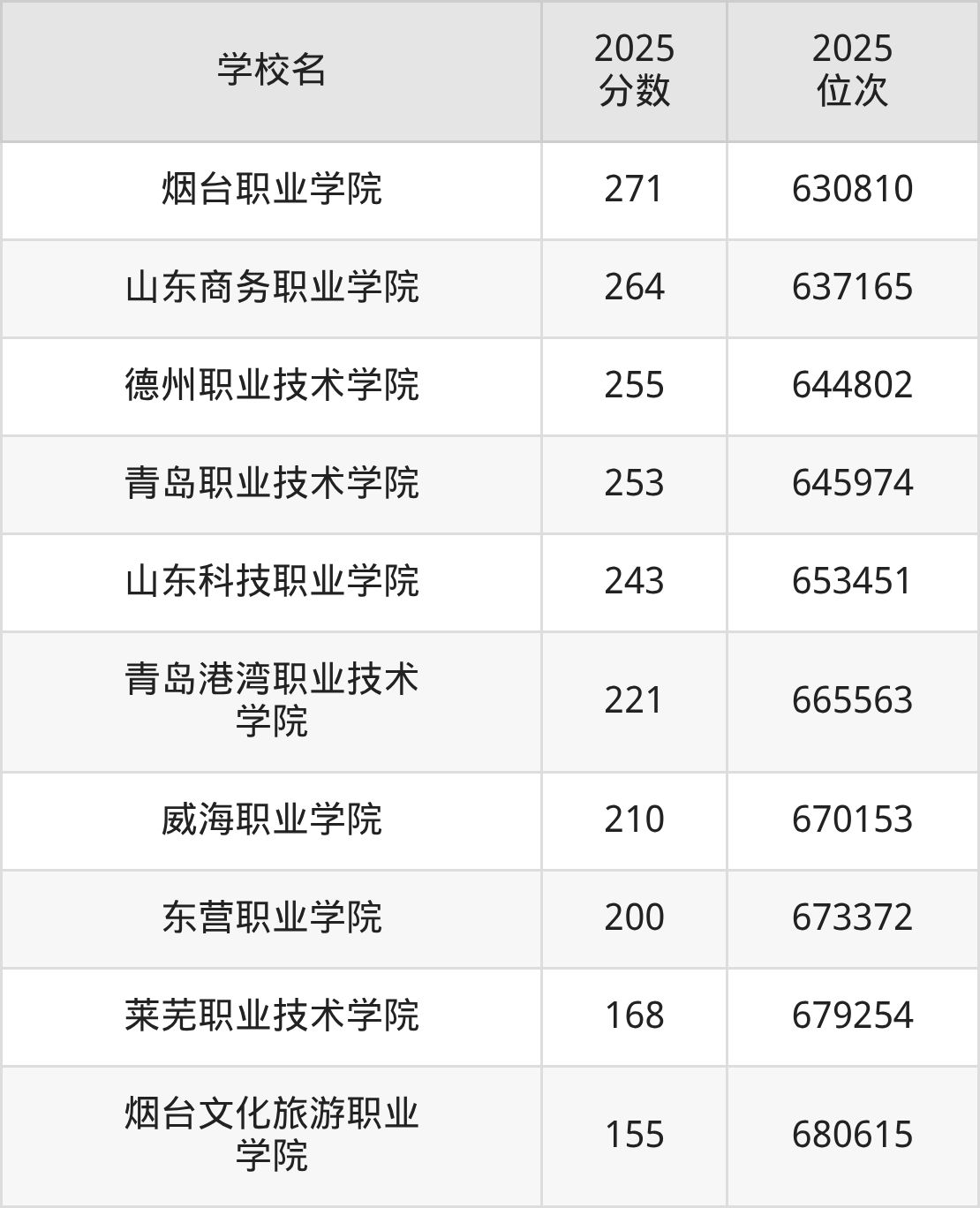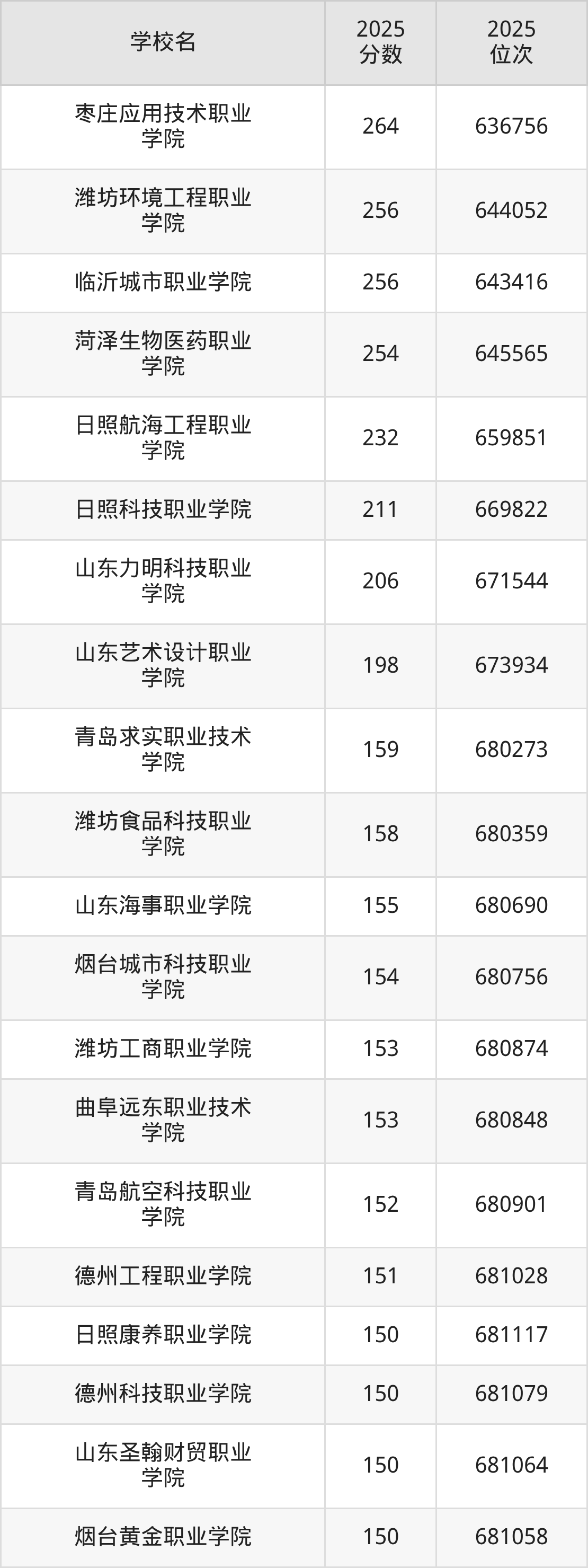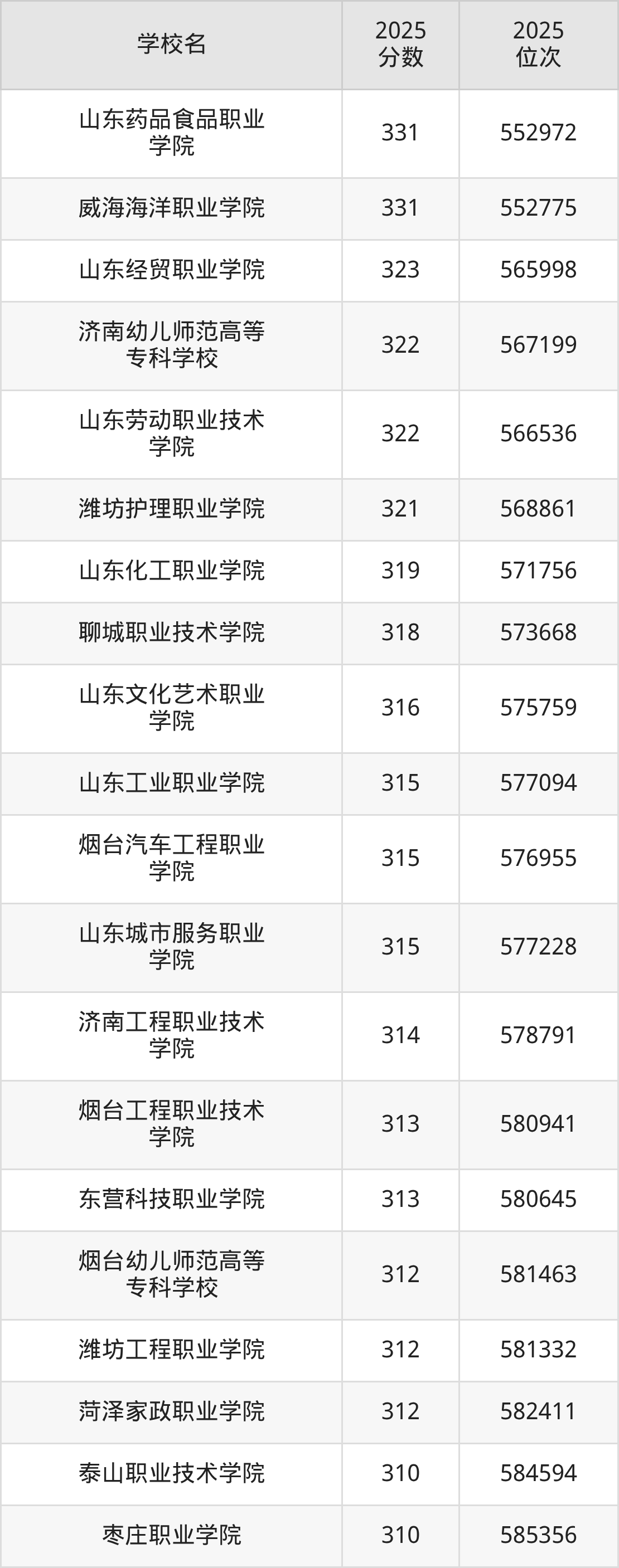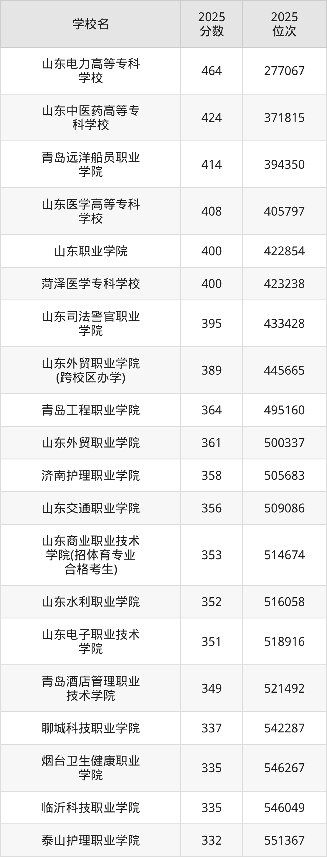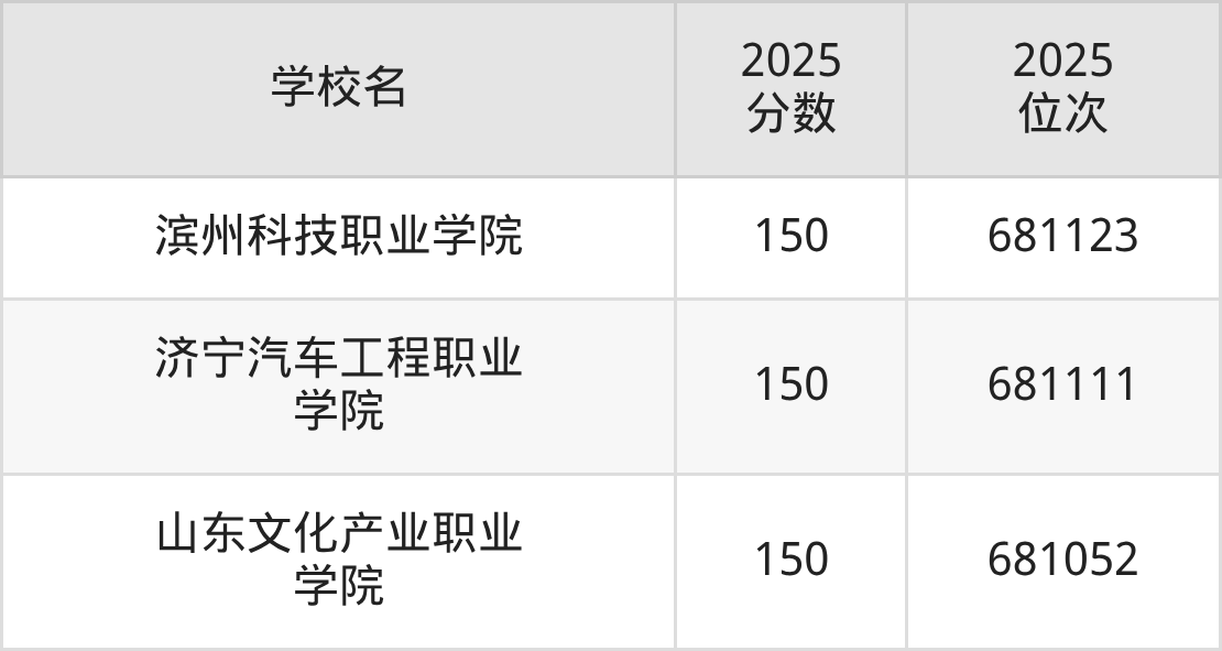 2025年山东省所有公办专科院校录取分数线一览表如下: