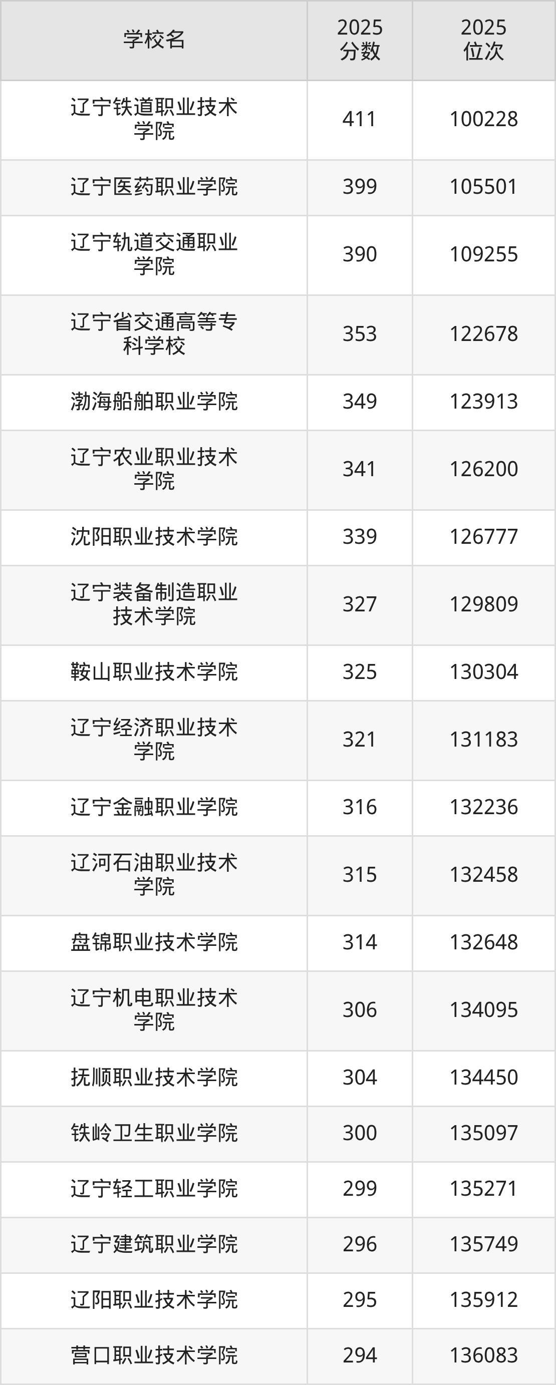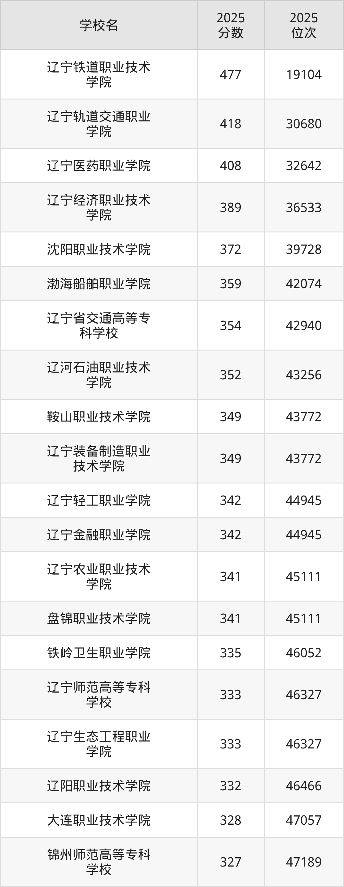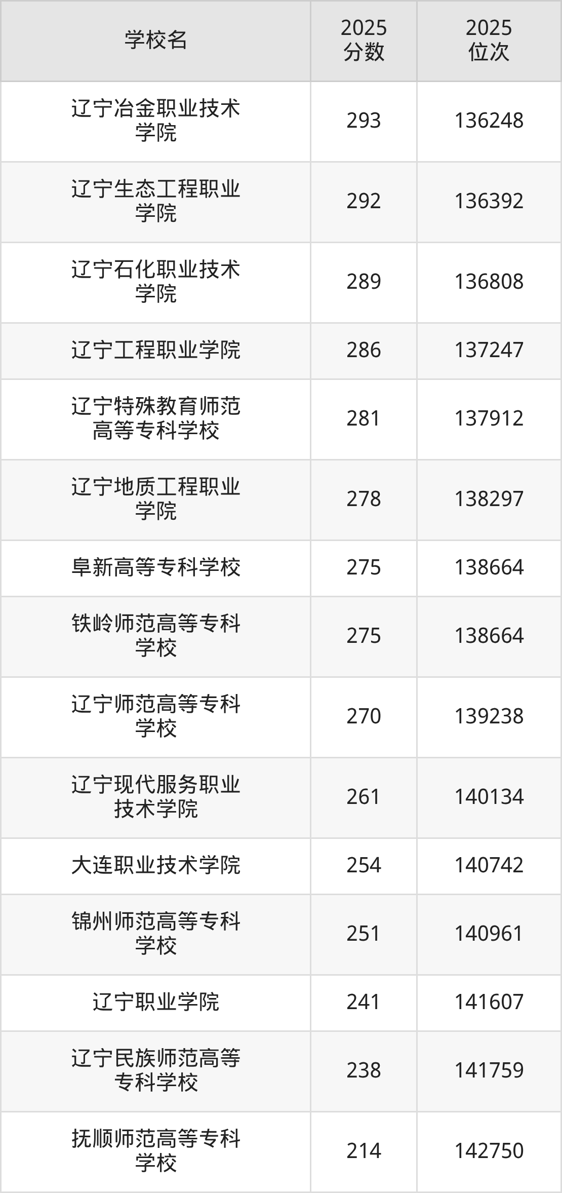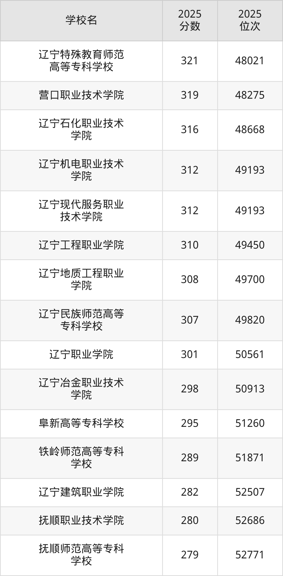 2025年辽宁省所有公办大专院校录取分数线一览表如下: