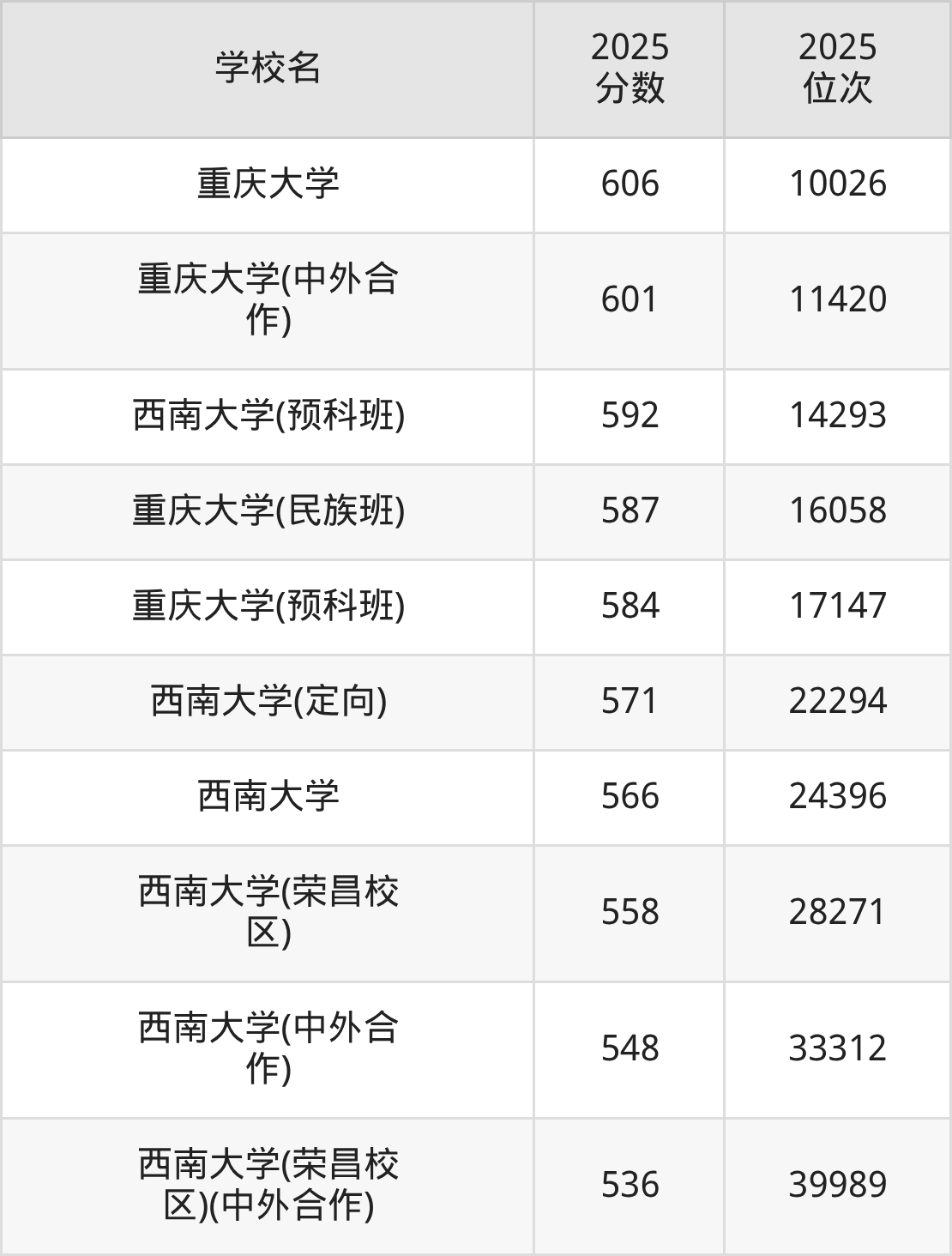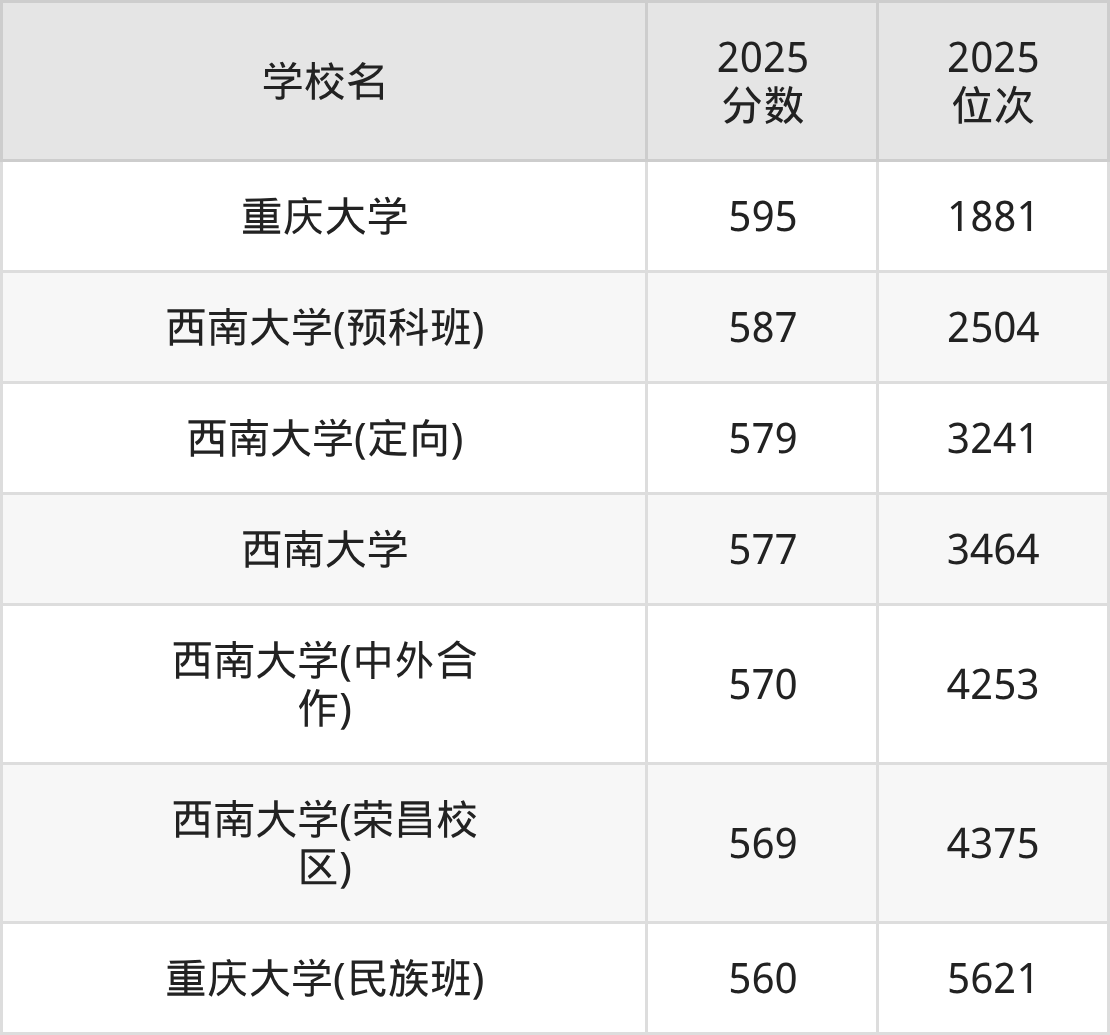 2025年重庆市所有双一流大学录取分数线一览表如下: