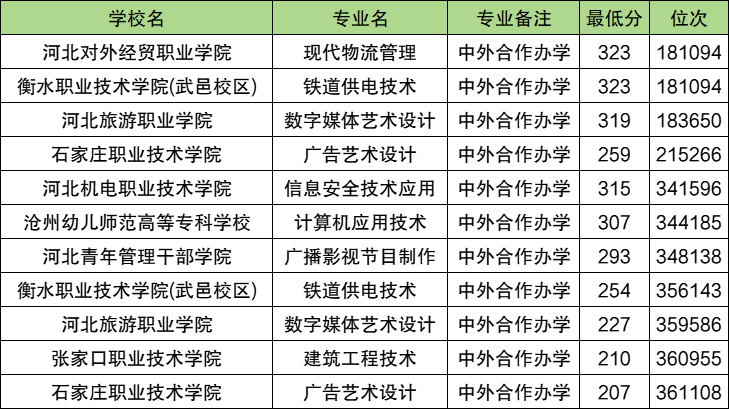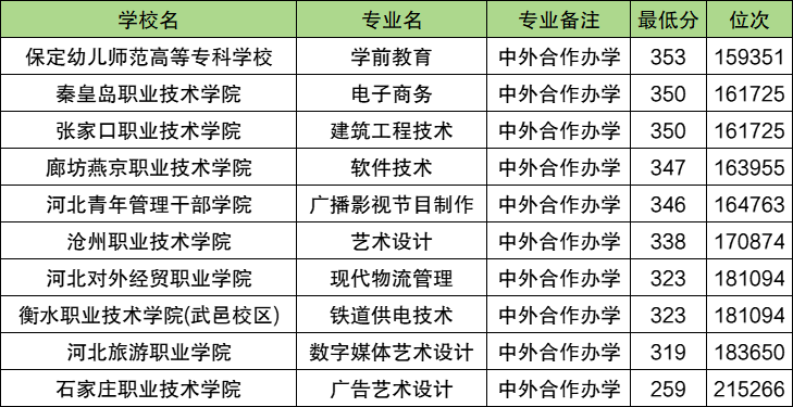 2025年河北公办大专学校最低录取分数线:历史类259分、物理类207分,收分最低的学校为石家庄职业技术学院,最低分专业为广告艺术设计(中外合作)。