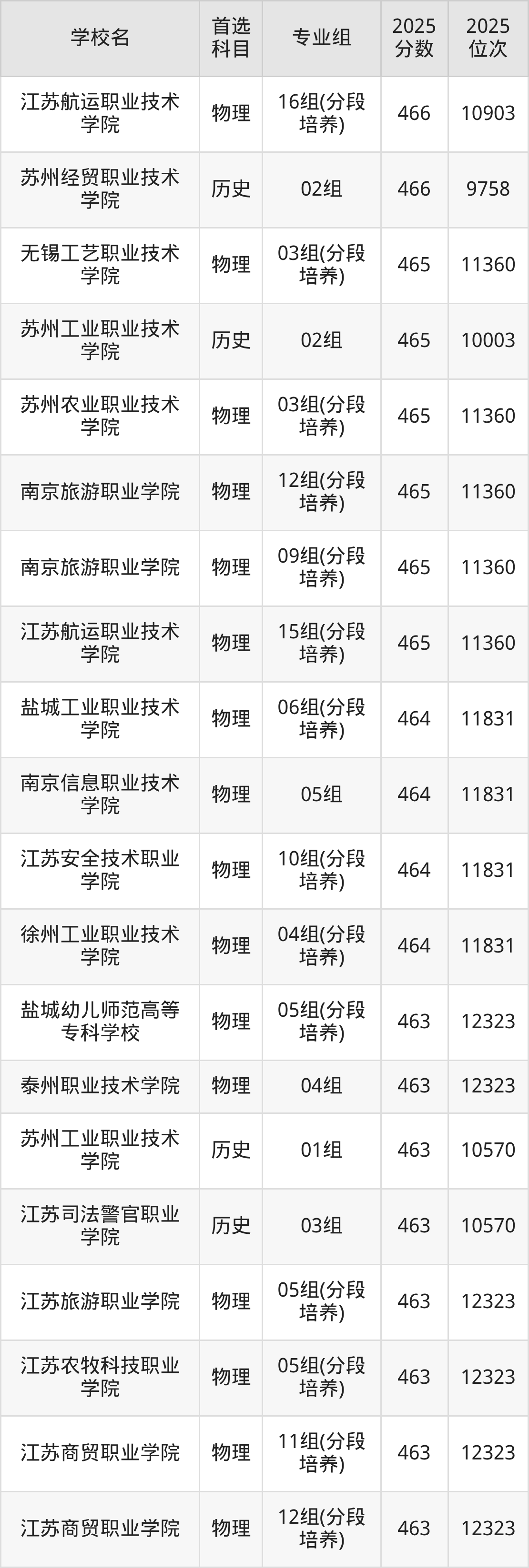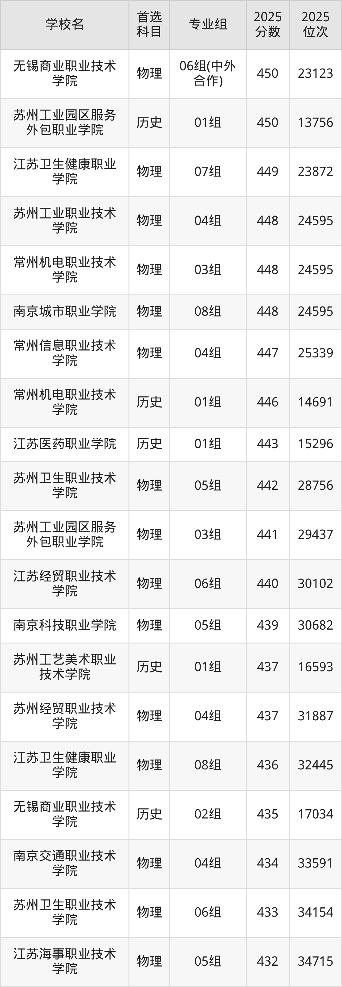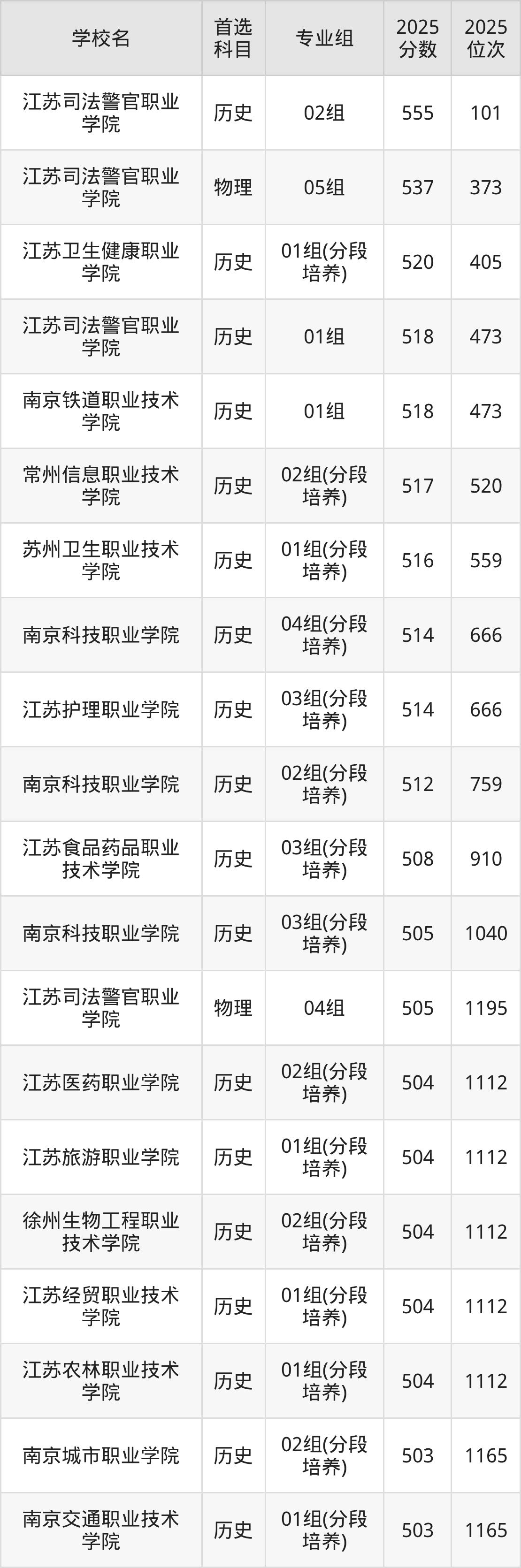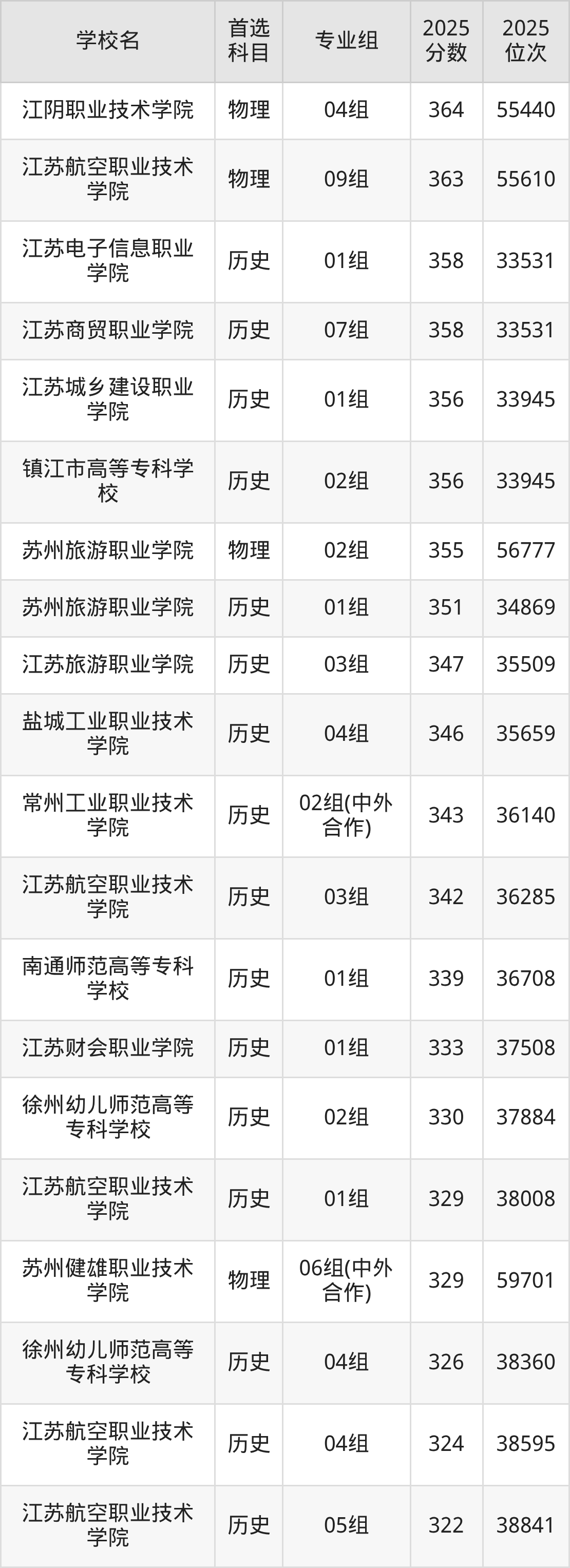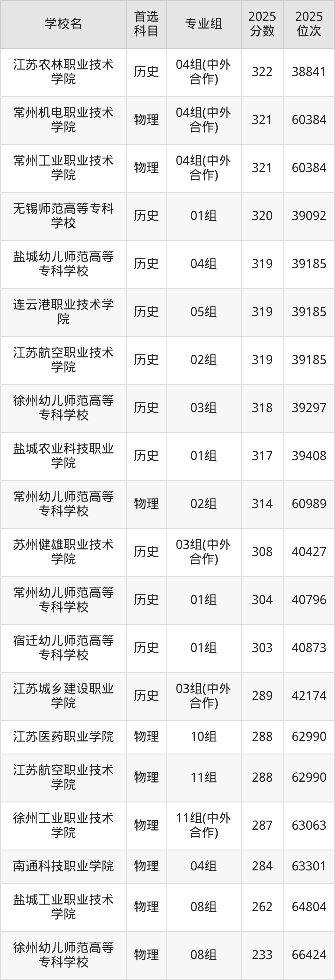2025年江苏省所有公办专科院校录取分数线一览表如下: