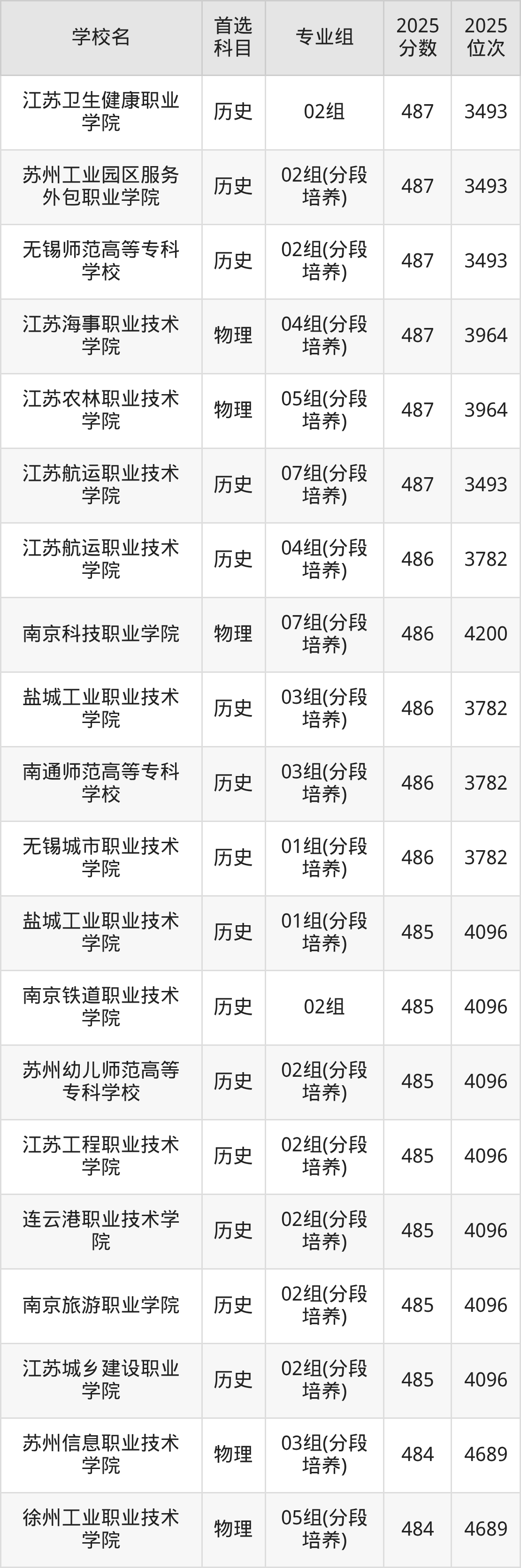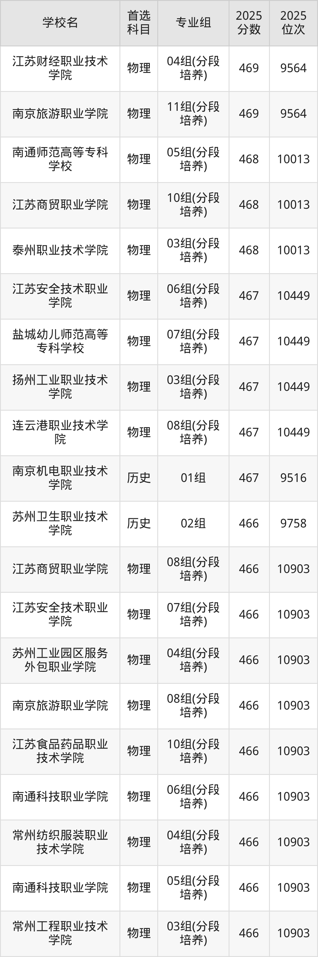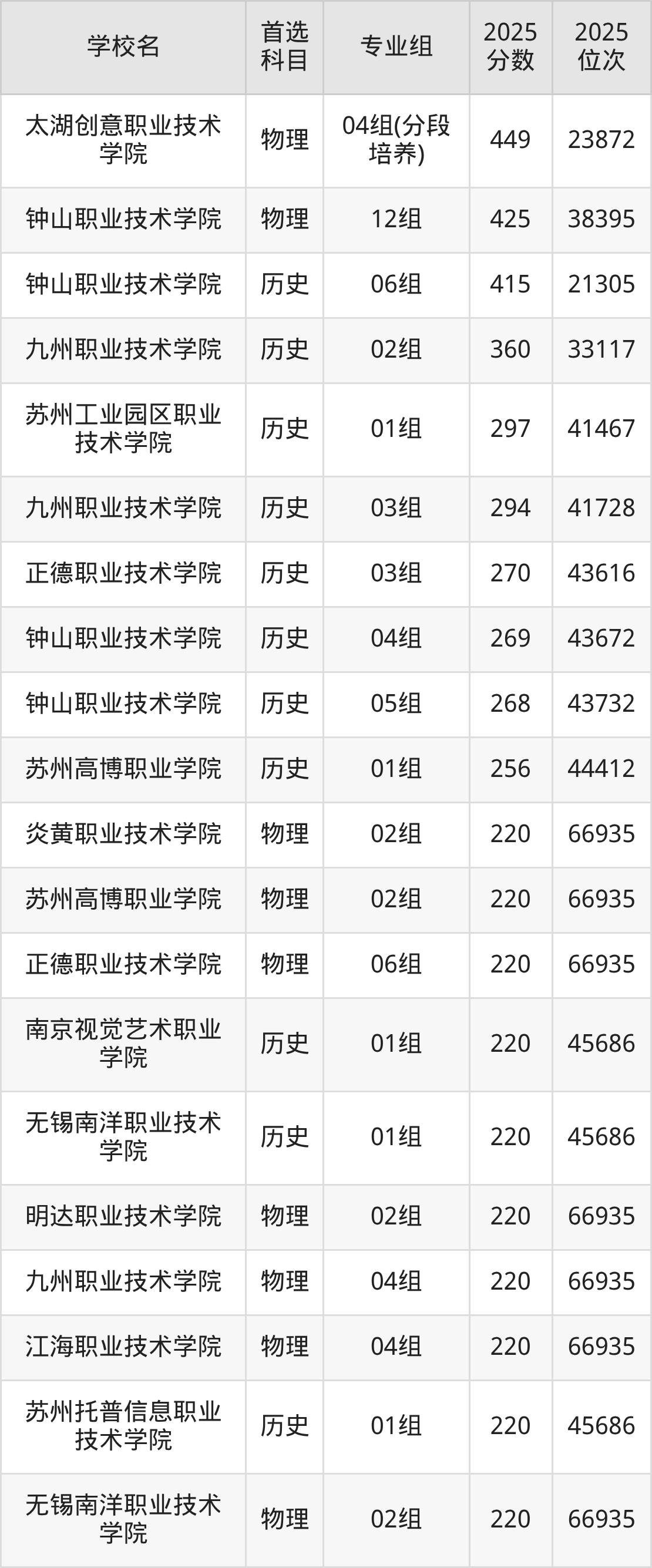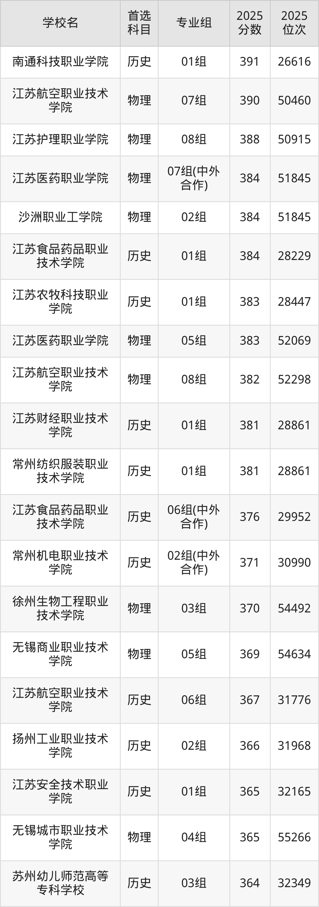 2025年江苏省所有公办专科院校录取分数线一览表如下: