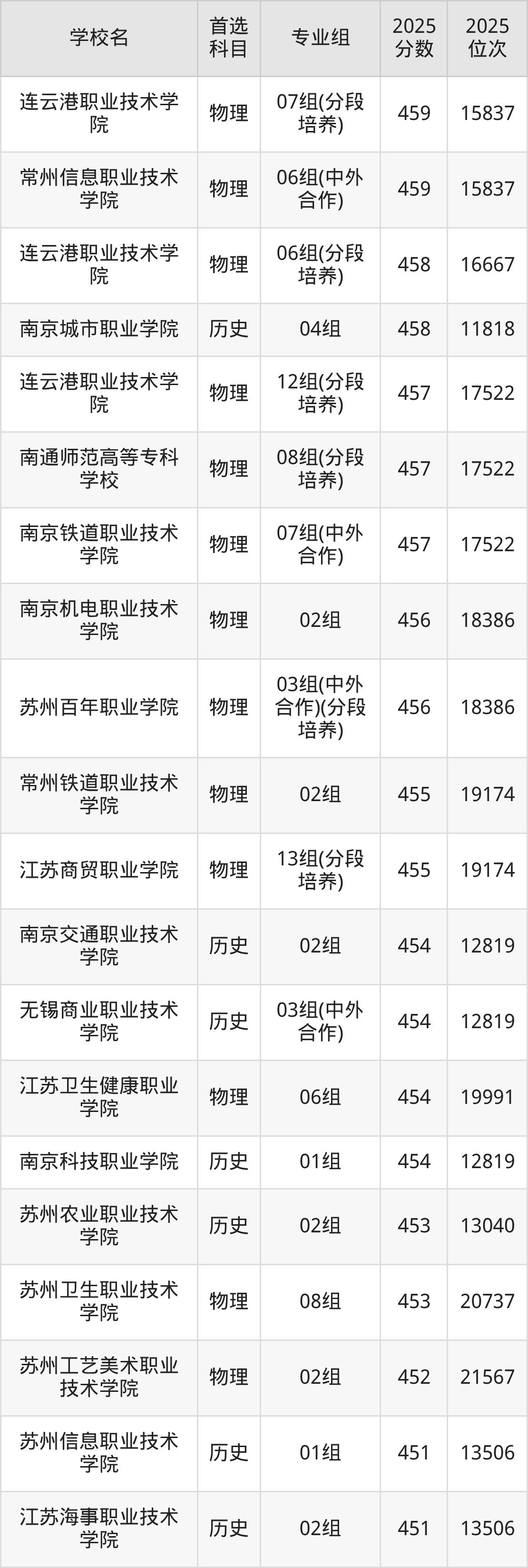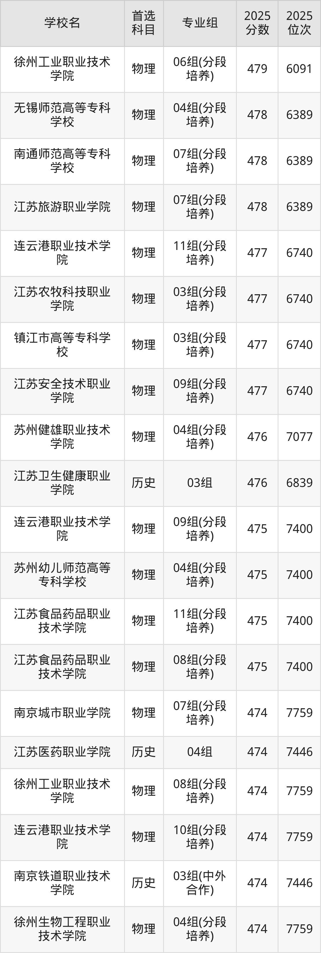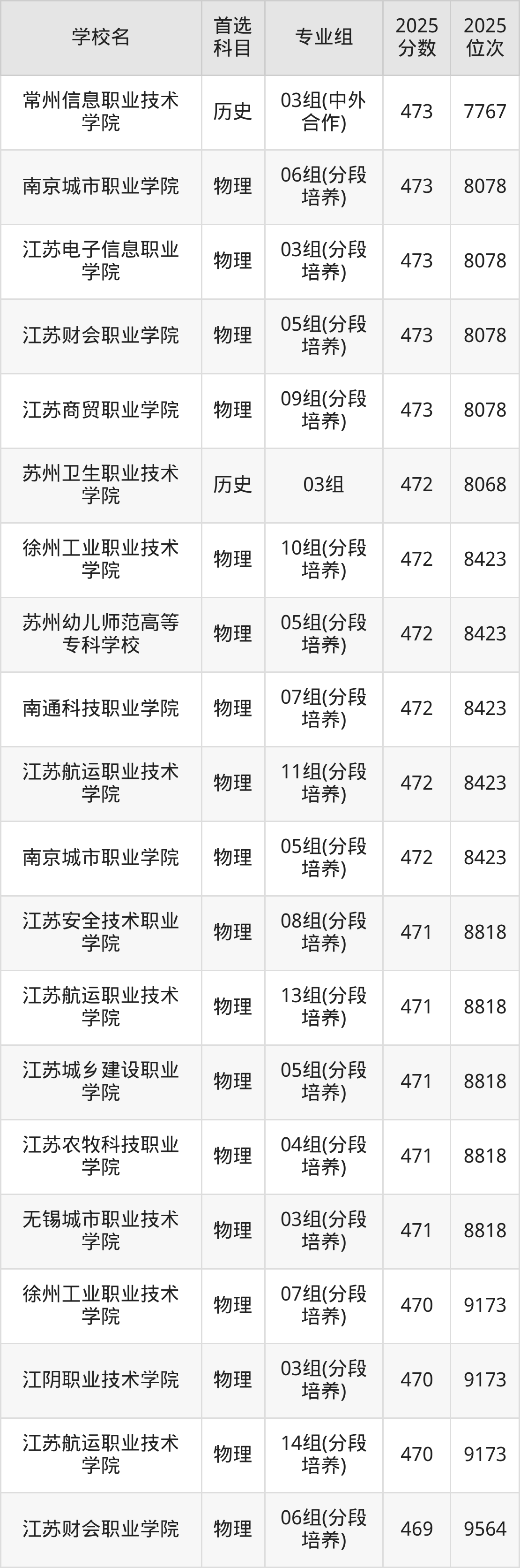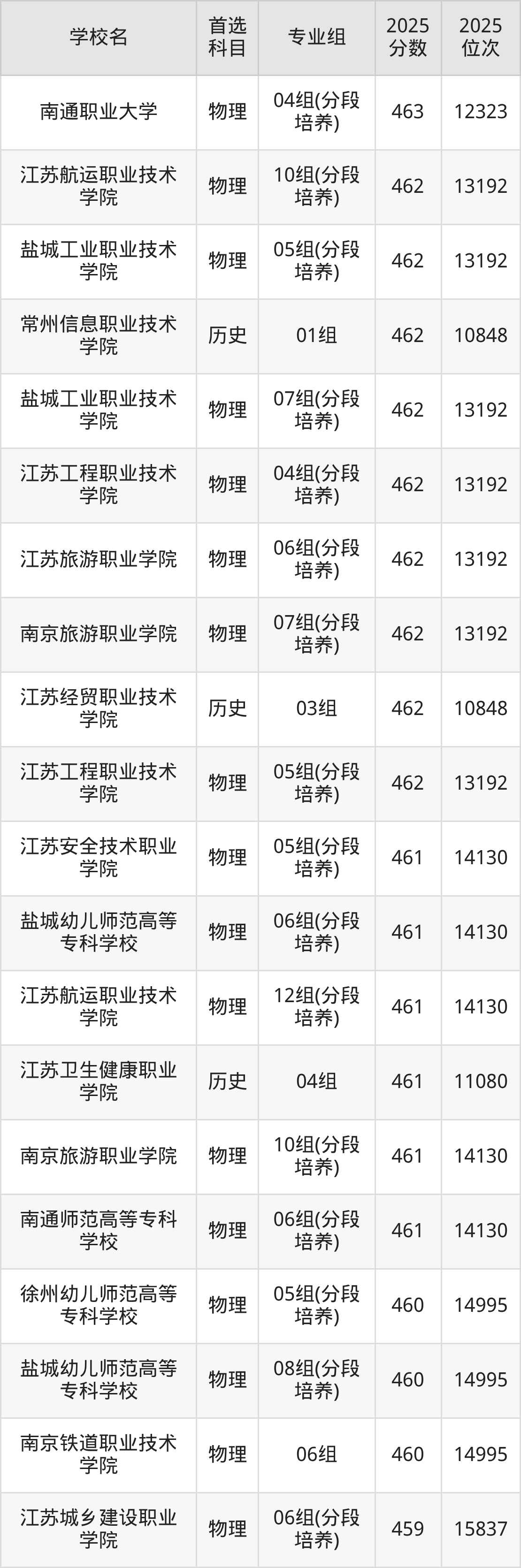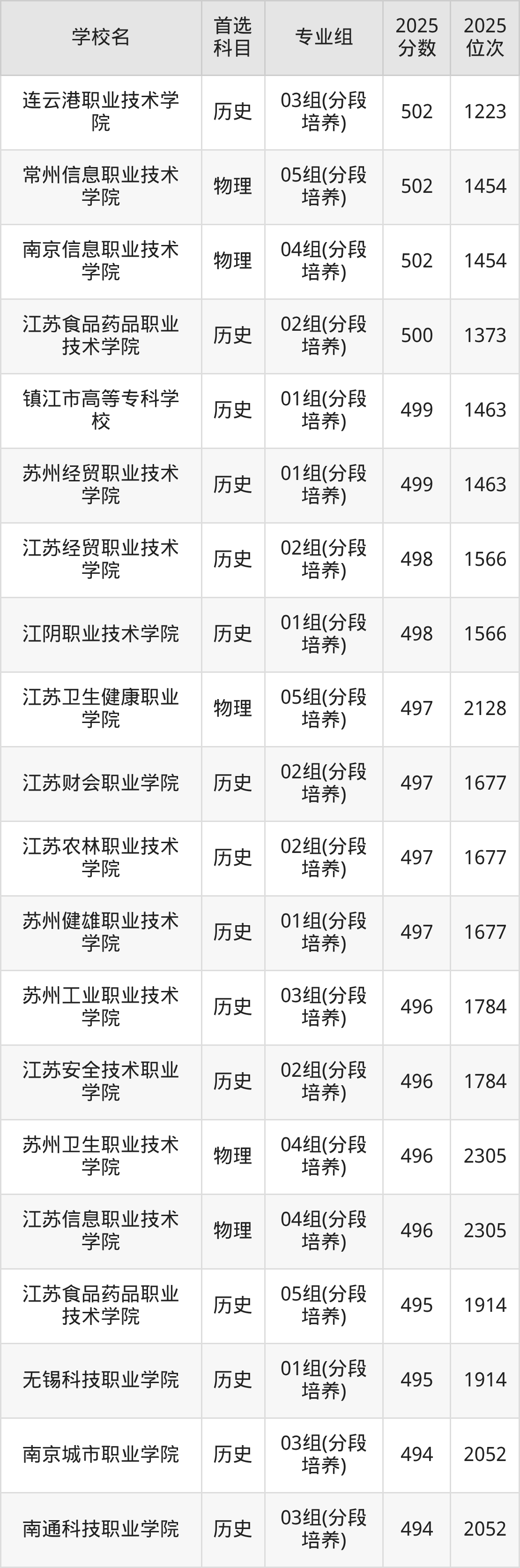 2025年江苏省所有公办专科院校录取分数线一览表如下:
