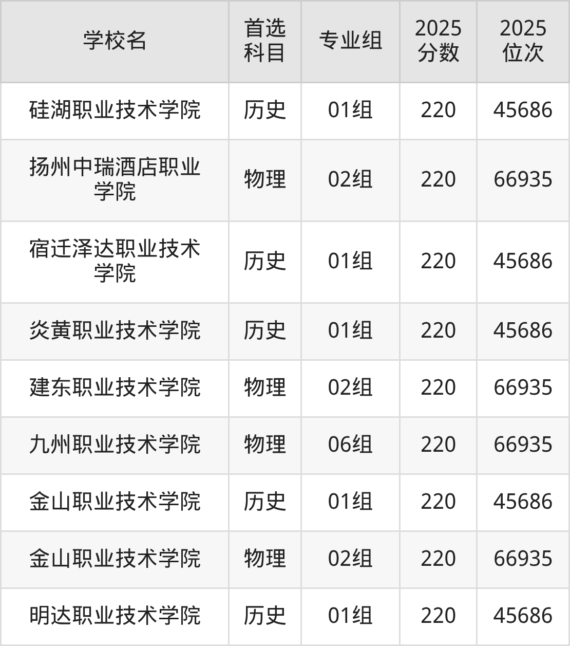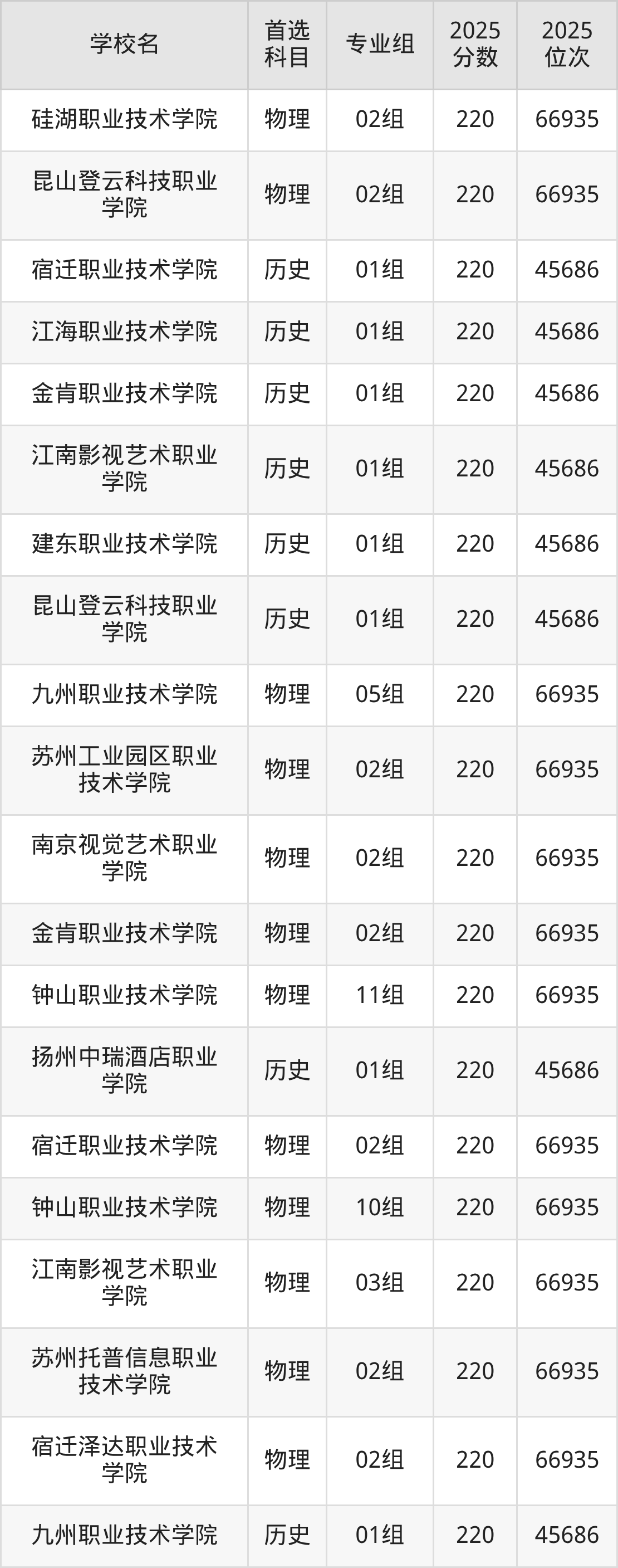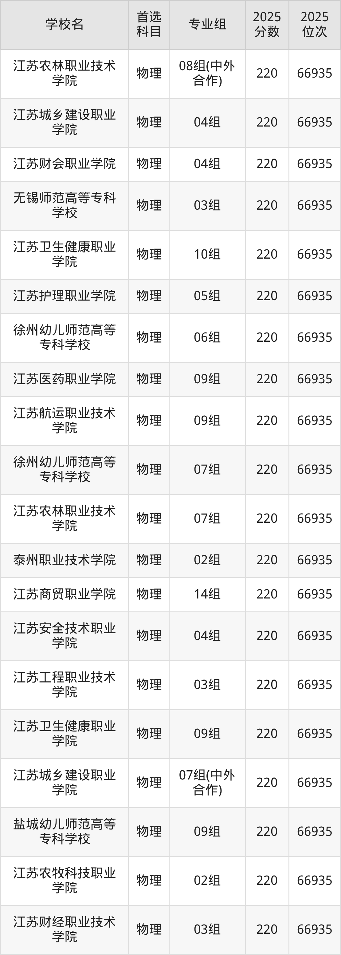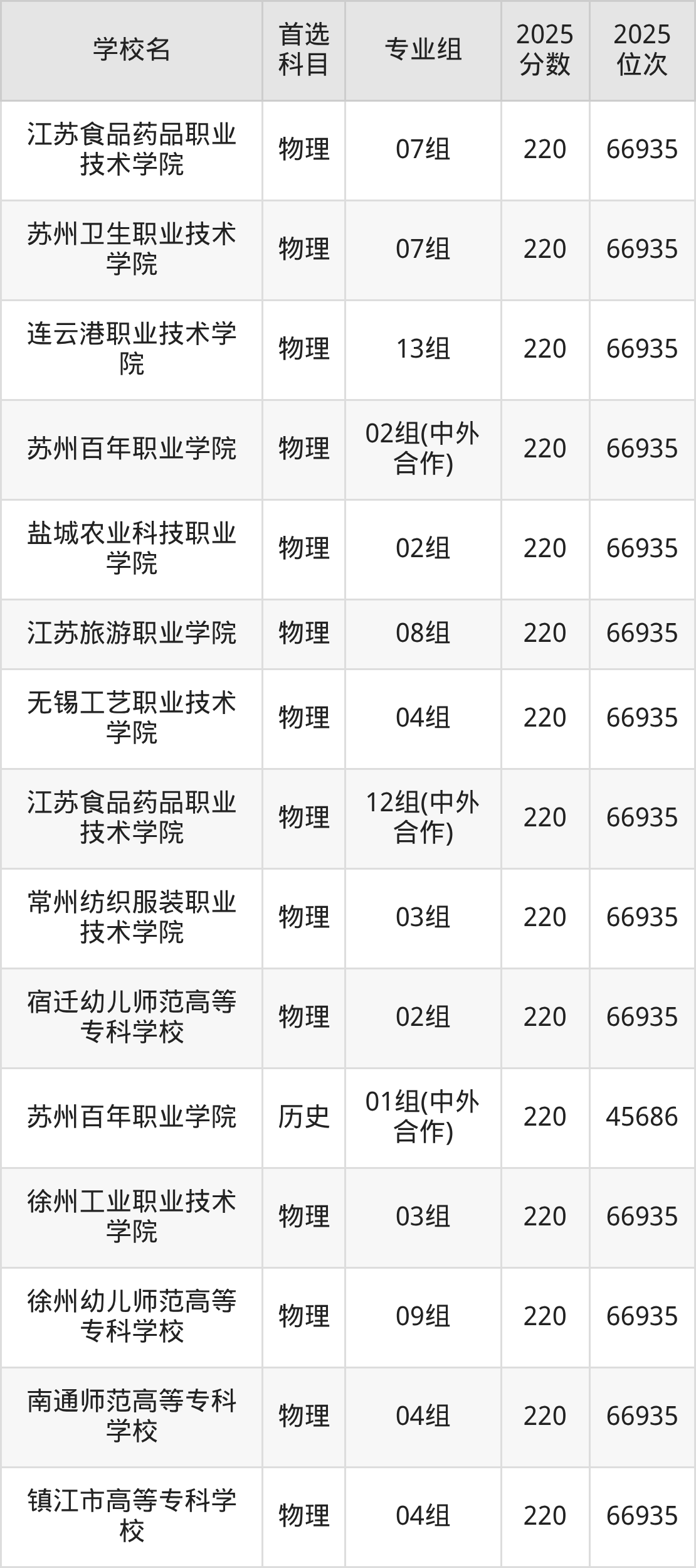 2025年江苏公办专科院校最低录取分数线历史类是220分,分数线最低的学校是苏州百年职业学院,对应收分最低的专业组是01组(中外合作)。物理类最低分是220分,分数线最低的学校是江苏农林职业技术学院、江苏城乡建设职业学院、江苏财会职业学院等,对应收分最低的专业组依次是08组(中外合作)、04组、04组等。