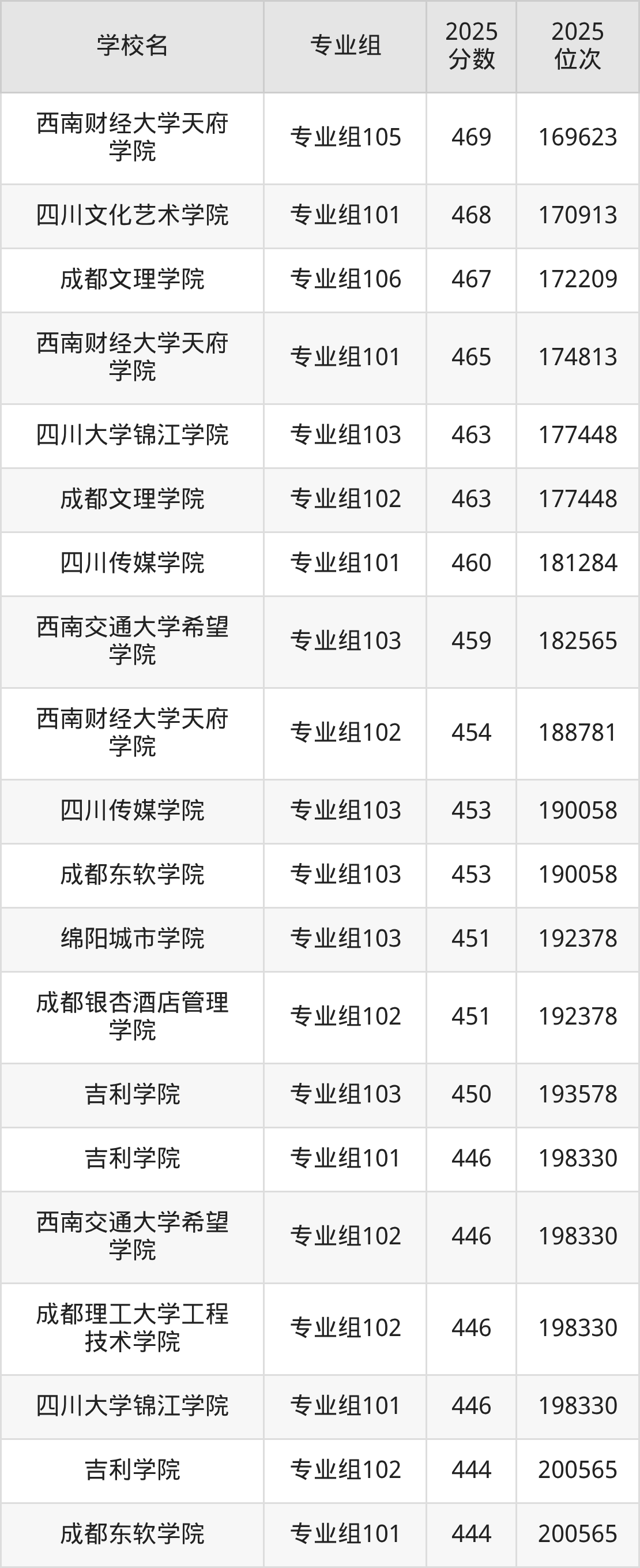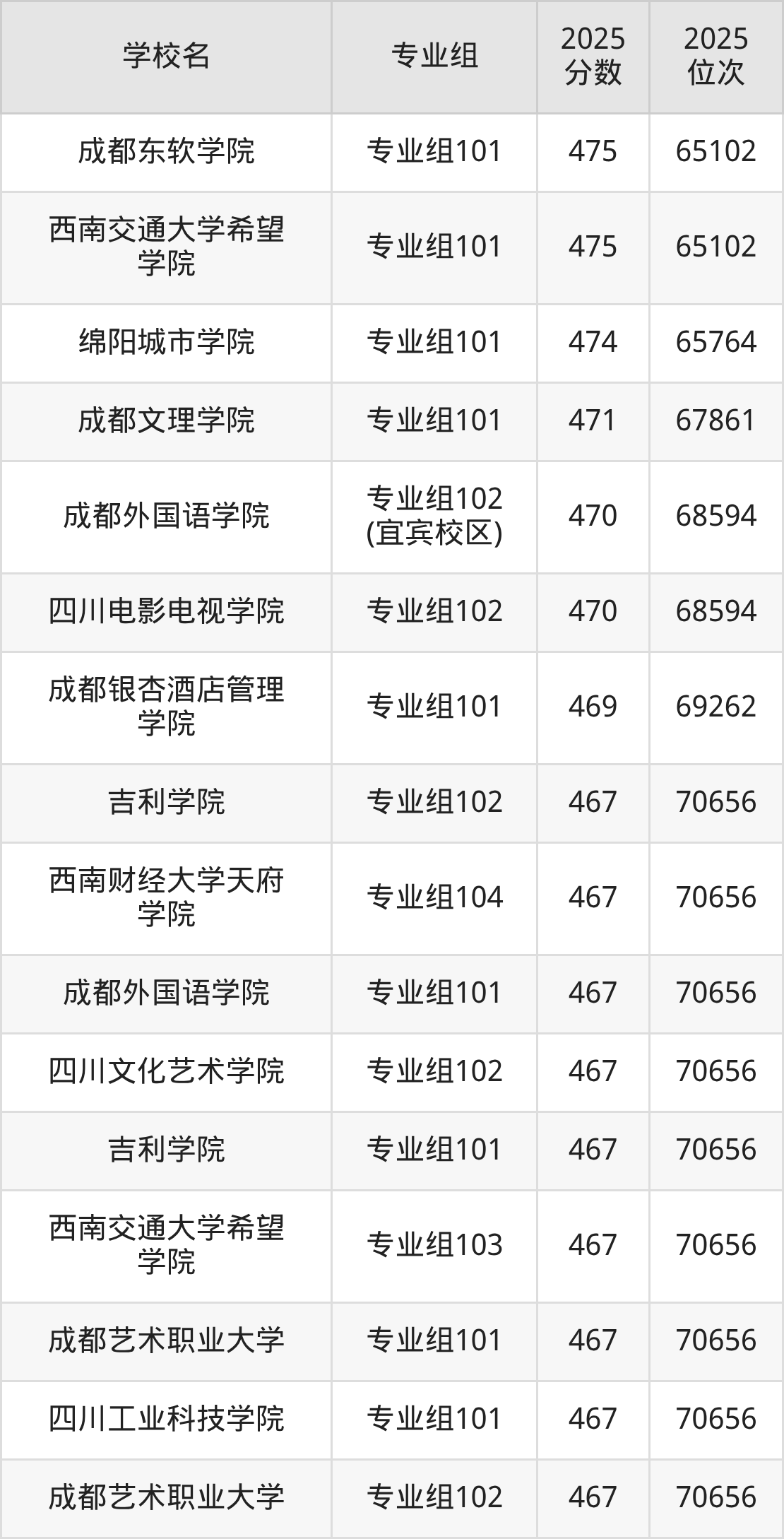 2025年四川民办本科大学最低录取分数线历史类是467分,分数线最低的学校是吉利学院、西南财经大学天府学院、成都外国语学院等,对应收分最低的专业组依次是专业组102、专业组104、专业组101等。
