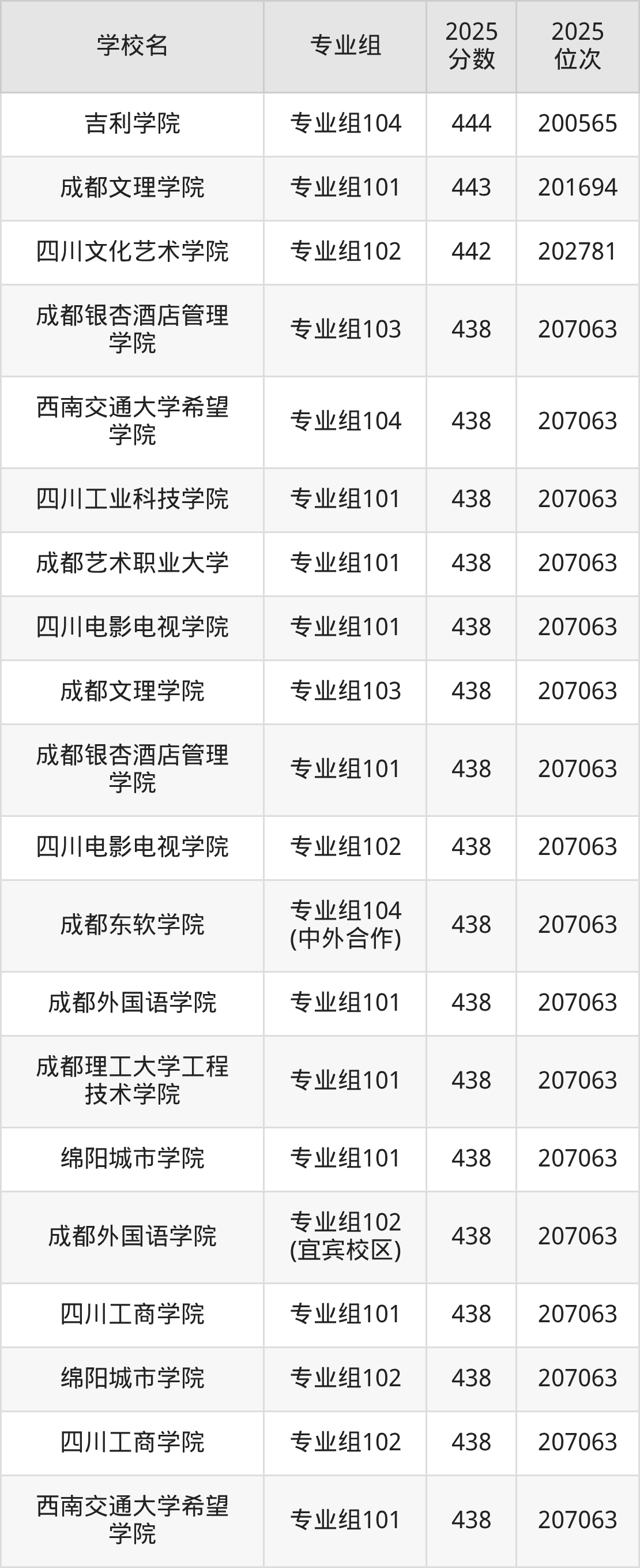 2025年四川民办本科大学最低录取分数线物理类是438分,分数线最低的学校是成都银杏酒店管理学院、西南交通大学希望学院、四川工业科技学院等,对应收分最低的专业组依次是专业组103、专业组104、专业组101等。