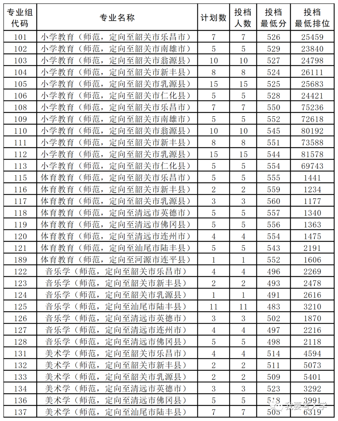 下文为韶关学院在广东提前批公费师范生录取分数线一览表: