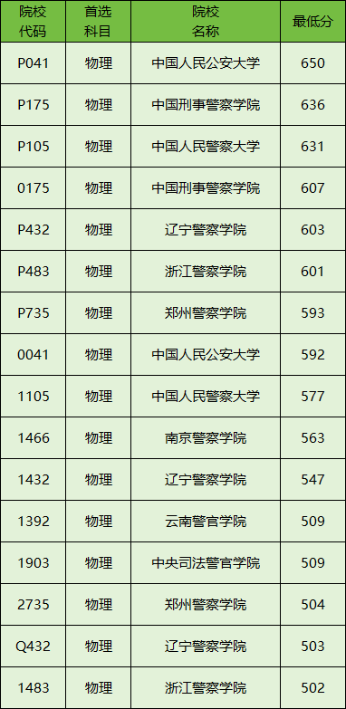 2024年辽宁警校首选物理组最低录取分数线是502分,收分最低的是浙江警察学院(代码:1483);分数线最高的是中国人民公安大学(代码:P041),2024年最低录取线650分。