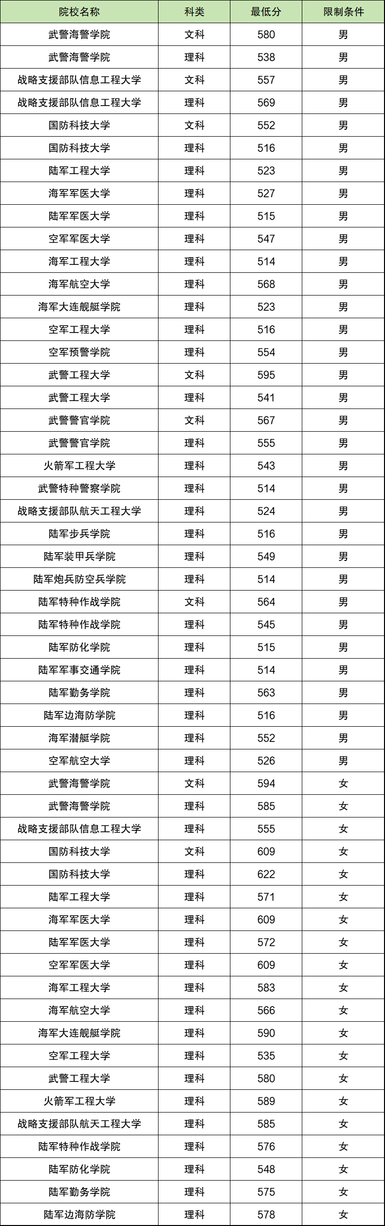 理科:陆军工程大学、陆军步兵学院、陆军炮兵防空兵学院、陆军军事交通学院、战略支援部航天工程大学、武警特种警察学院、武警海警学院,分数线为520分,仅限男生报考;还有一所陆军防化学院,也是520分,不过不限性别,男女生都可报考。