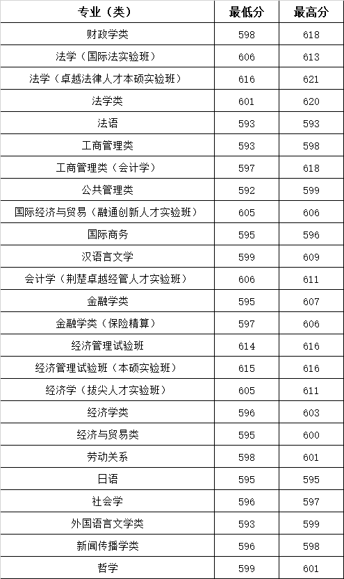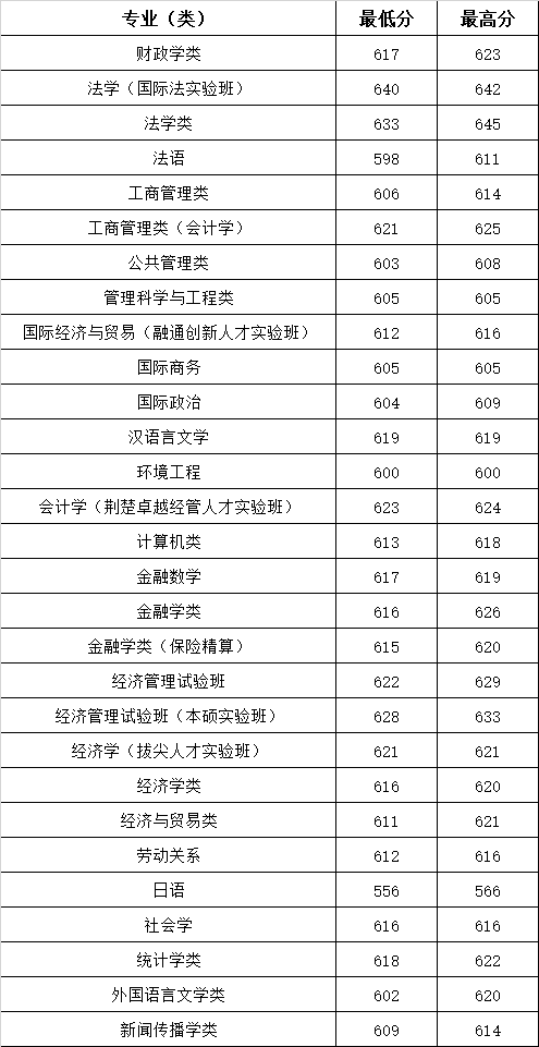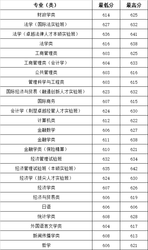 在湖北物理类最低603分、对应工商管理类、公共管理类、管理科学与工程类专业,最高642分、对应经济管理试验班(本硕实验班)专业。