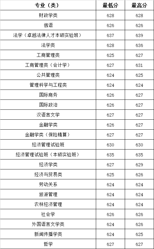 在河南文史类最低624分、对应公共管理类、管理科学与工程类、劳动关系、旅游管理、农林经济管理、外国语言文学类、新闻传播学类专业,最高639分、对应法学(卓越法律人才本硕实验班)专业。