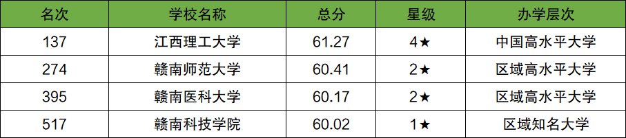 注:本文整理出的赣州各大学排名均为赣州公办本科院校的排名。